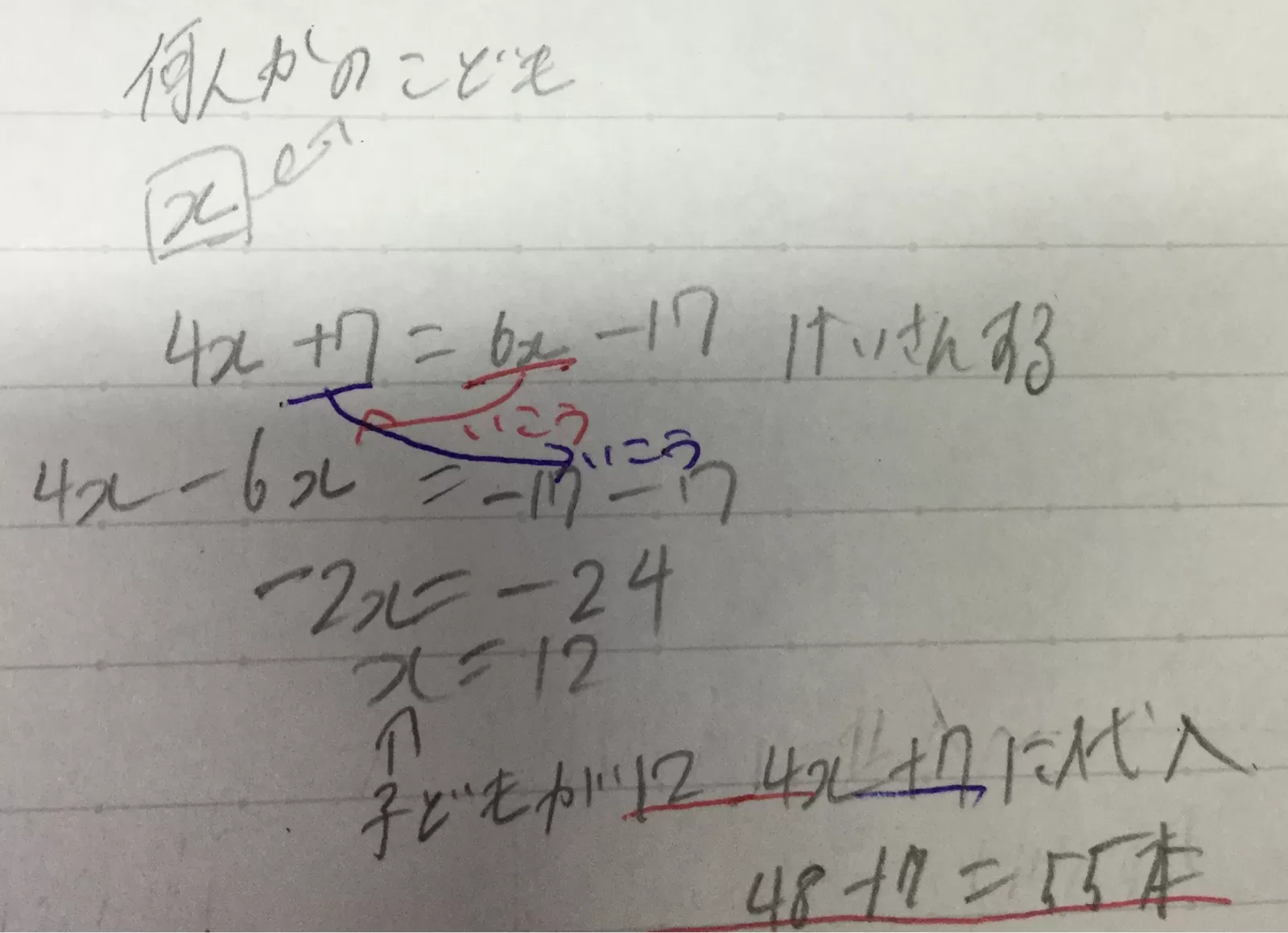 6本ずつにすると17本不足します。子どもと鉛筆の数はどれだけてすか。