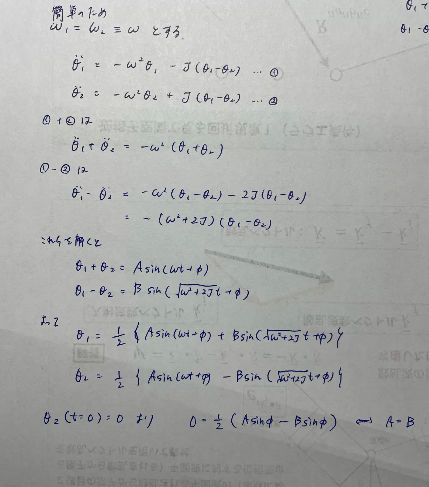 ひとつの振り子のうなりに関しては、θ1(θ2)の成分だけ取り出して和積の公式でまとめればうなりが導出できます。