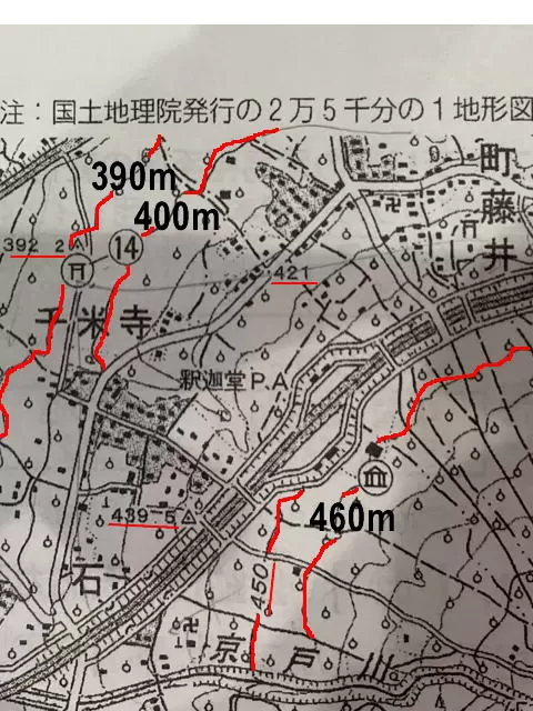 450の数字が等高線に描かれています。これから、等高線は10m間隔であることが分かります。
