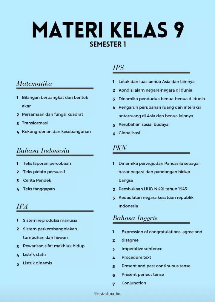 HALOO aku mau nanyaaa materi bahasa Indonesia, bahasa Inggris dan PPKn kelas 9 itu apa aja yaa? terimakasih!