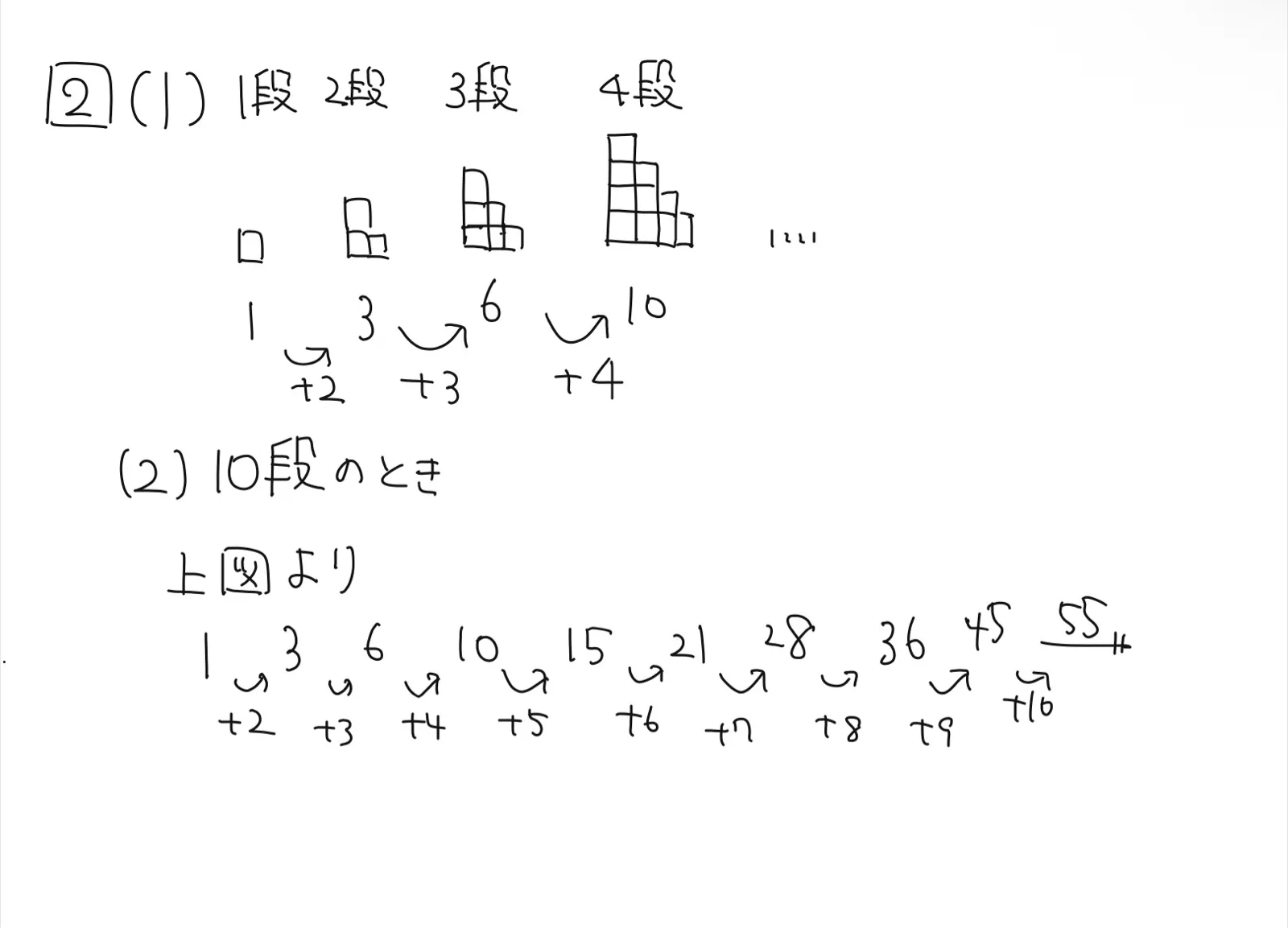 ⑵は2,3,4,…とタイルの数が増えていっているので10段の時は順に数えると、1,3,6,10,15,21,28,36,45,55となります。