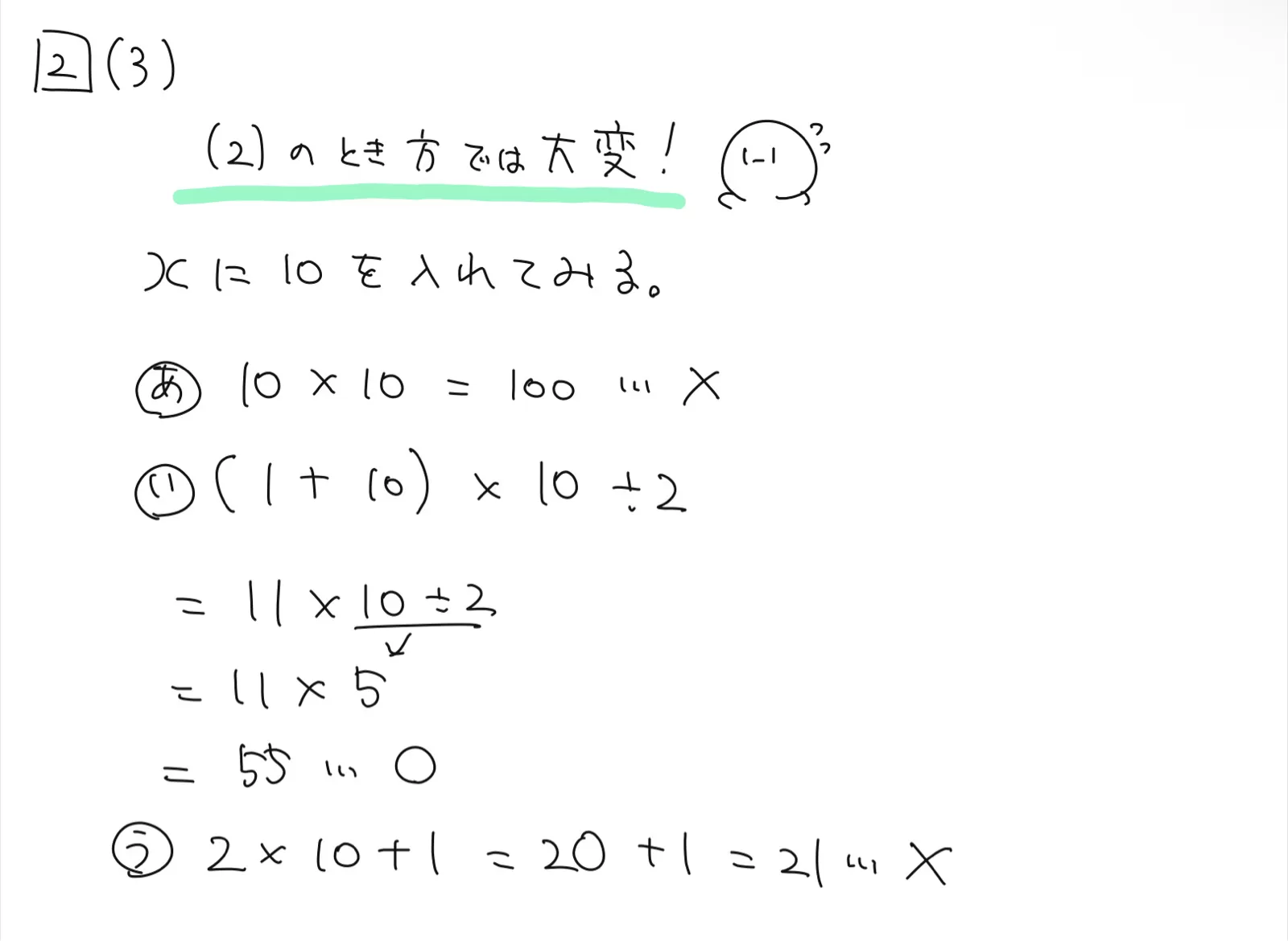 最後に⑶は、上記のことを考え、10をxに入れて同じ答えになった記号が答えになります。