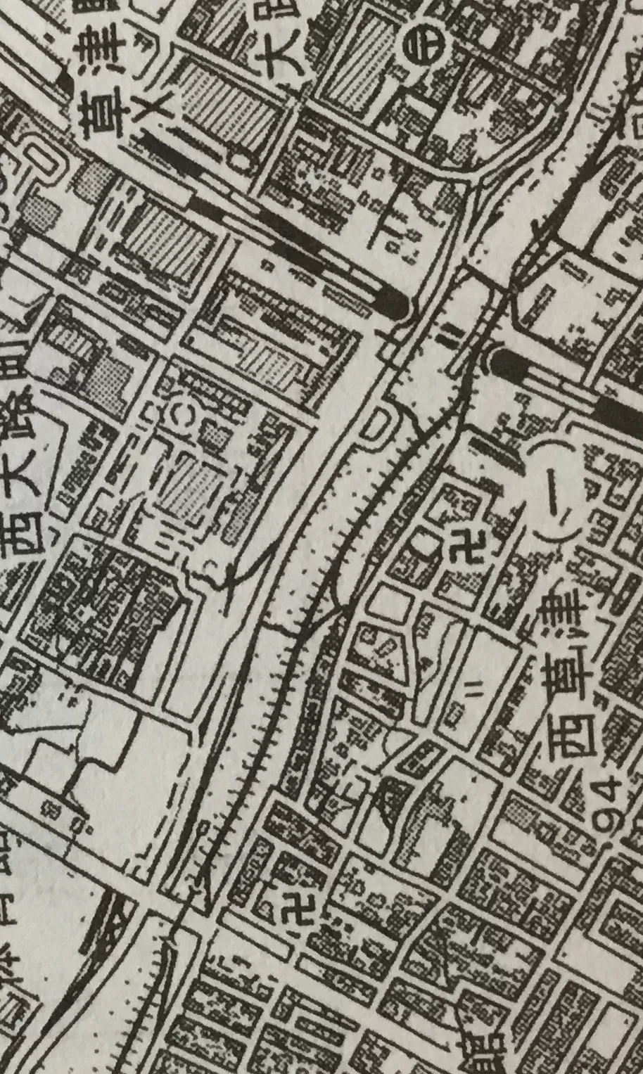 _細い線で描かれた点々のない部分がないので、川ではない、と、分かります。砂礫地の点々があるので、舗装された暗渠でもない、と、分かります。