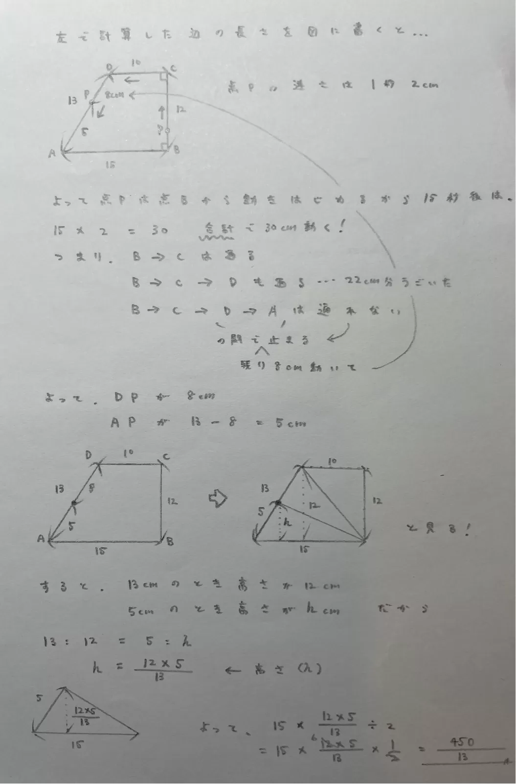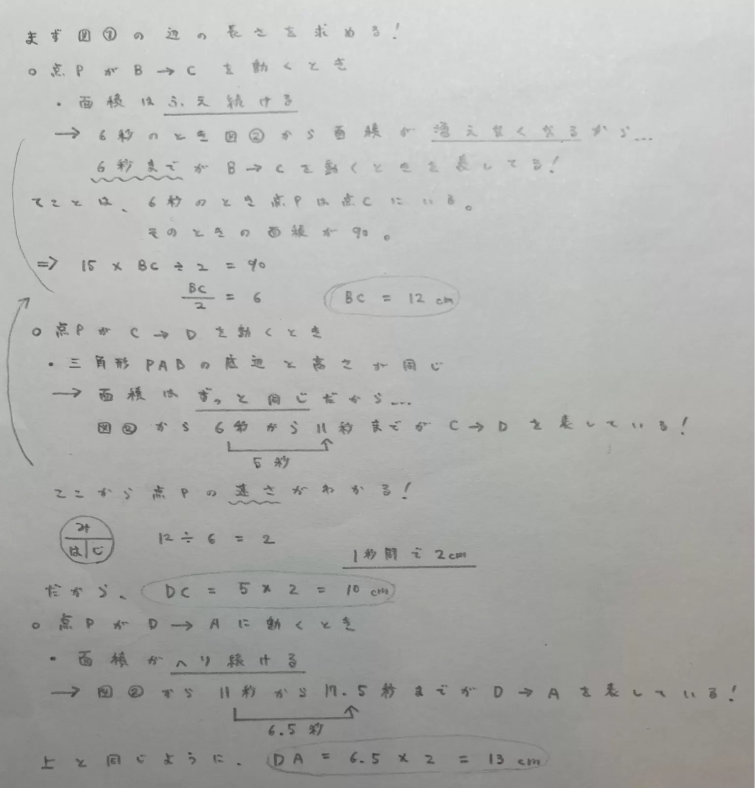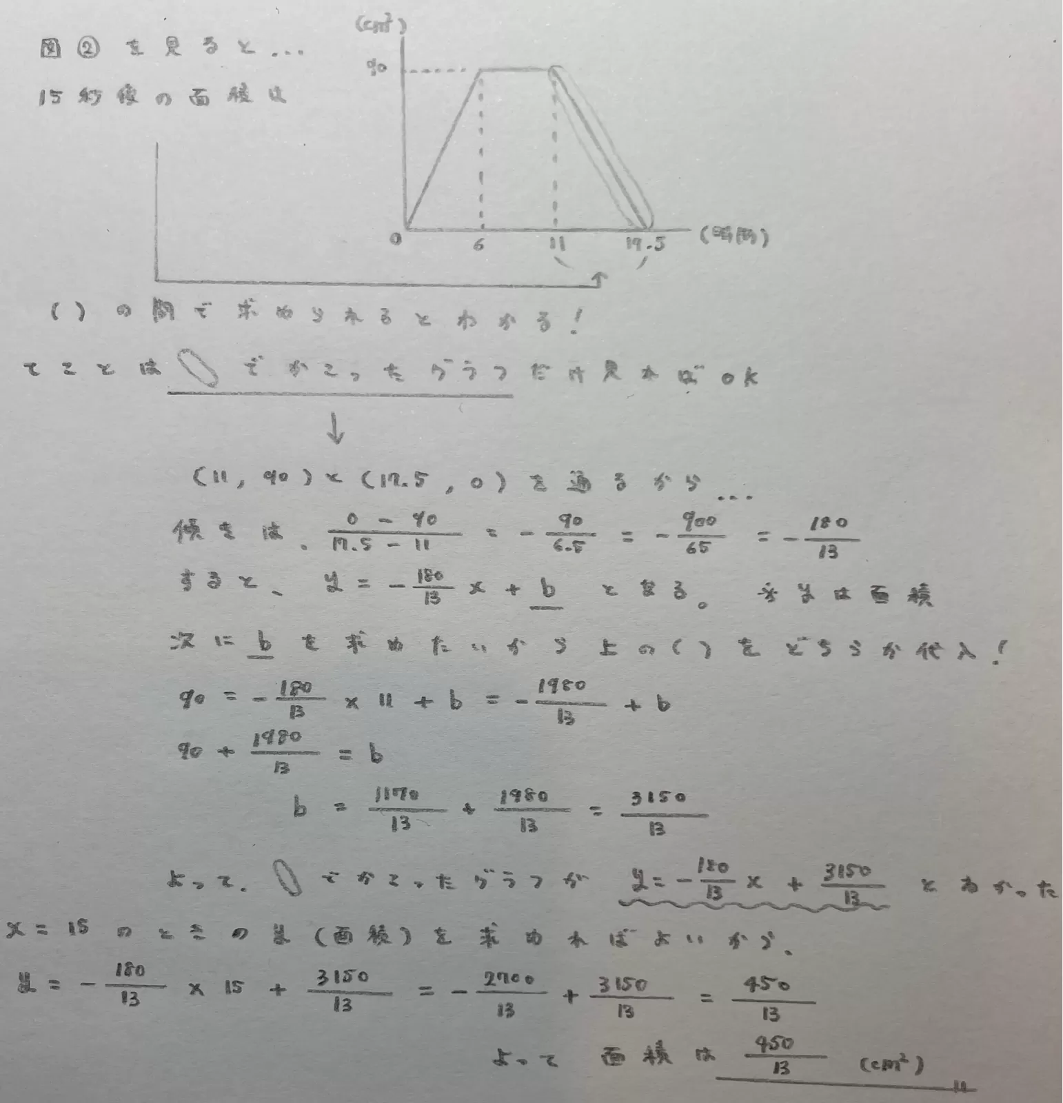 遅くなってごめんね😭図2の15秒のときが含まれてる直線の式を求めて、その式をつかって15秒のときの面積をもとめる!