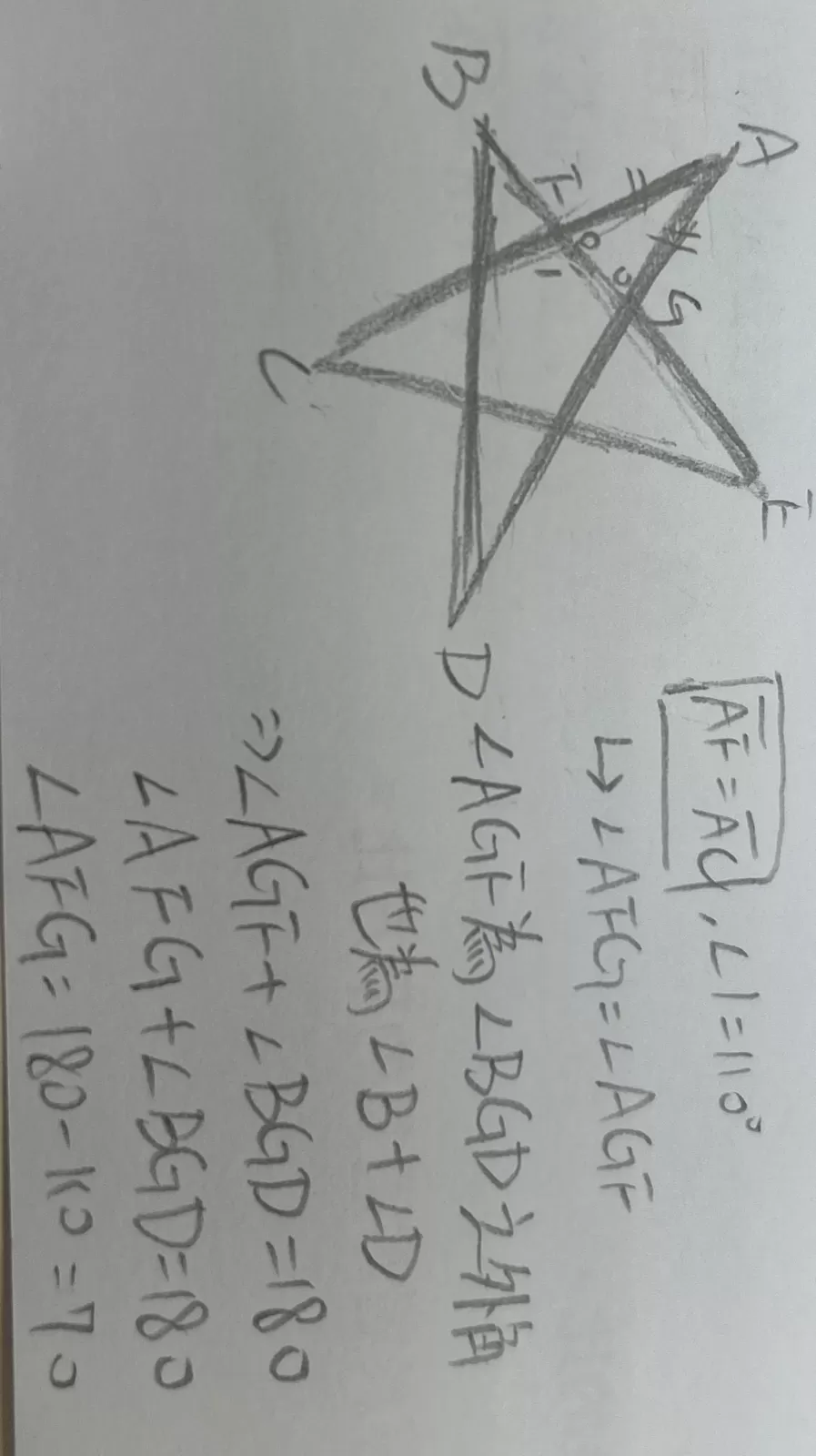 如右圖,五角星形中,AF=AG,若∠1=110°,則∠B+∠D的度數為何?