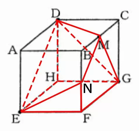 方体を、3点D、E、Mを通る平面で切断して2つの立体に分け、頂点Aを含む立体を取