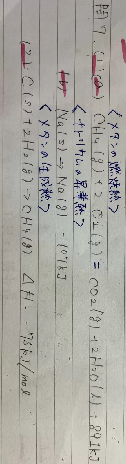また、今気付きましたが(1)(a)の熱化学方程式の矢印(→)をイコール(=)に直し、kJ/molもkJに直してください。