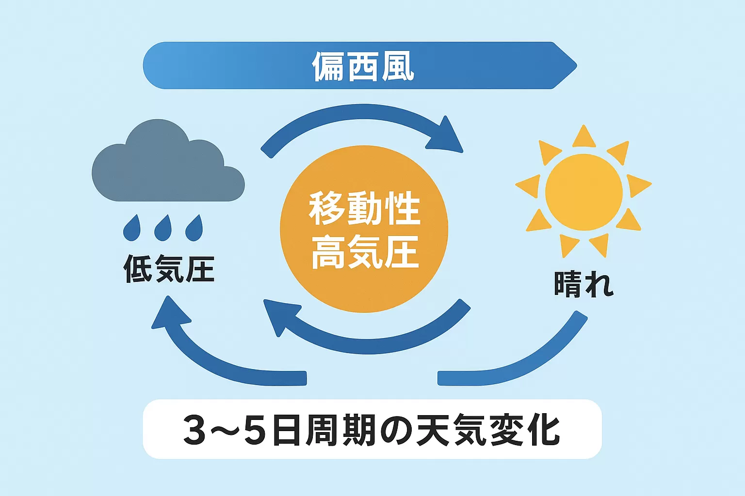 ここで高気圧と低気圧の特徴を考えると