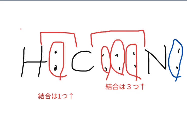 1.水素原子Hは価電子が1個、炭素原子Cは価電子が4個、窒素原子Nは価電子が5個ある。