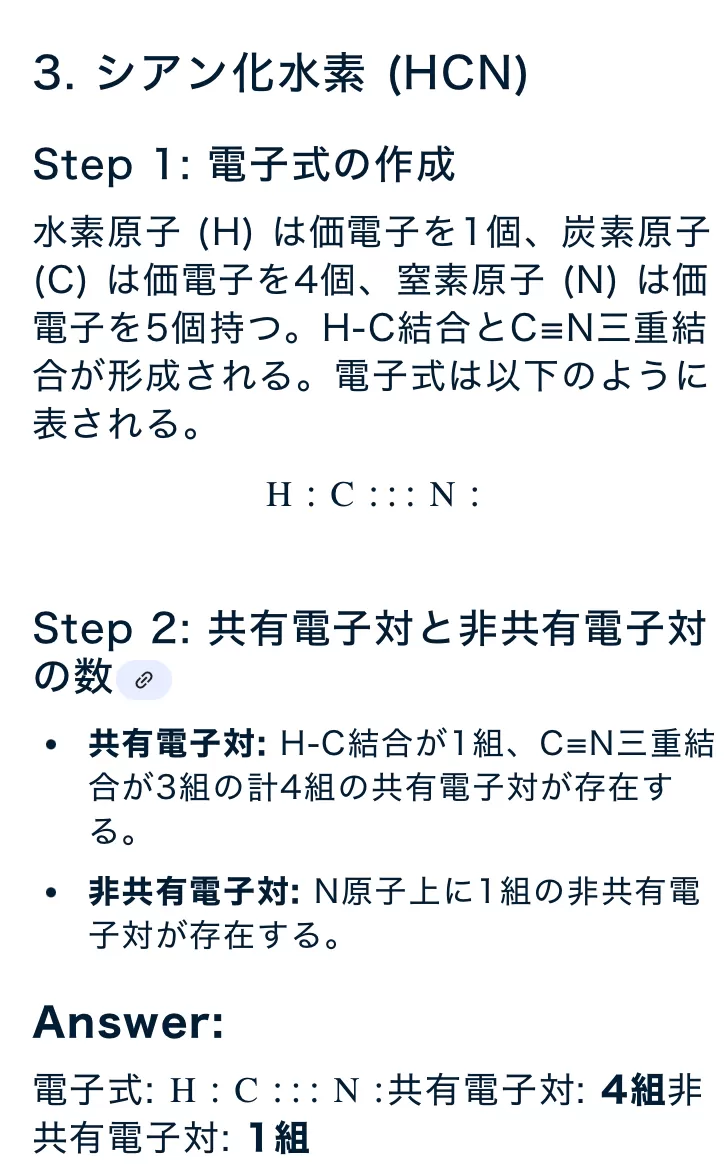 2.画像から、HとCの結合は1組、CとNの結合が3組(三重結合)だから共有結合は計4つ。