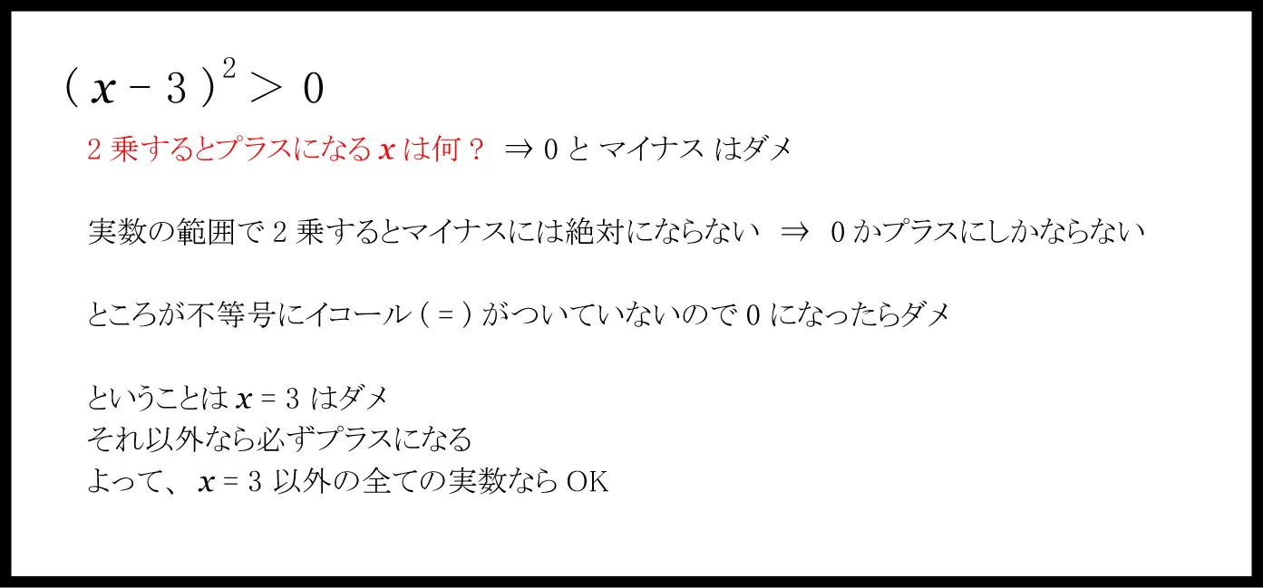 (x-3)^2>0のグラフを書いてみるとわかりやすいかもしれません。f(x)=(x-3)^2とおくとf(3)=0となります。0は0より大きいかと言われたらもちろん違います。よってf(x)=0にならなければどの値でもこの不等式が成り立ちます。よって3以外の全ての実数と求まるわけです。