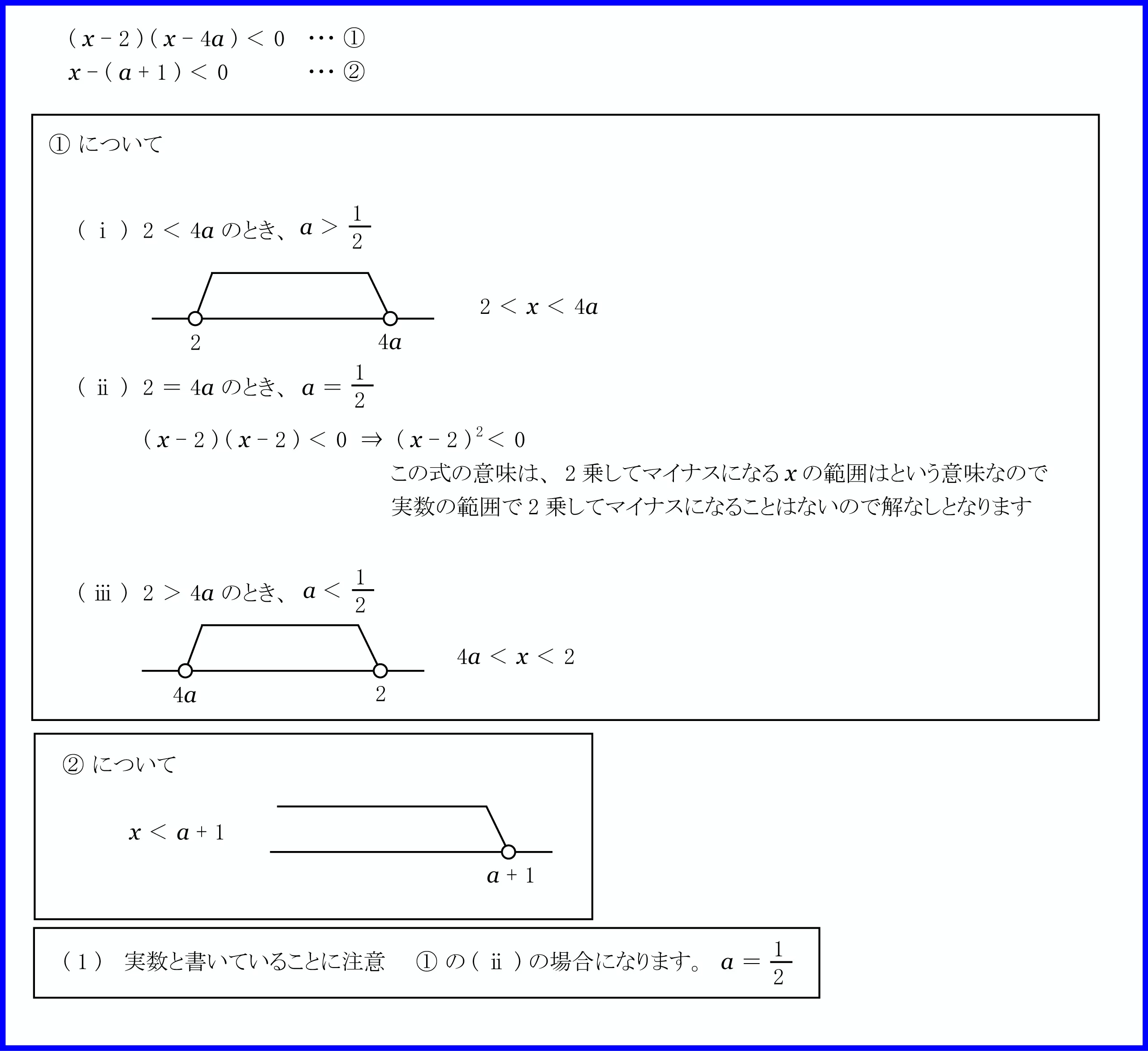 ①を満たす実数xの値の範囲は4a<x<2, ② を満たす実数xの値の範