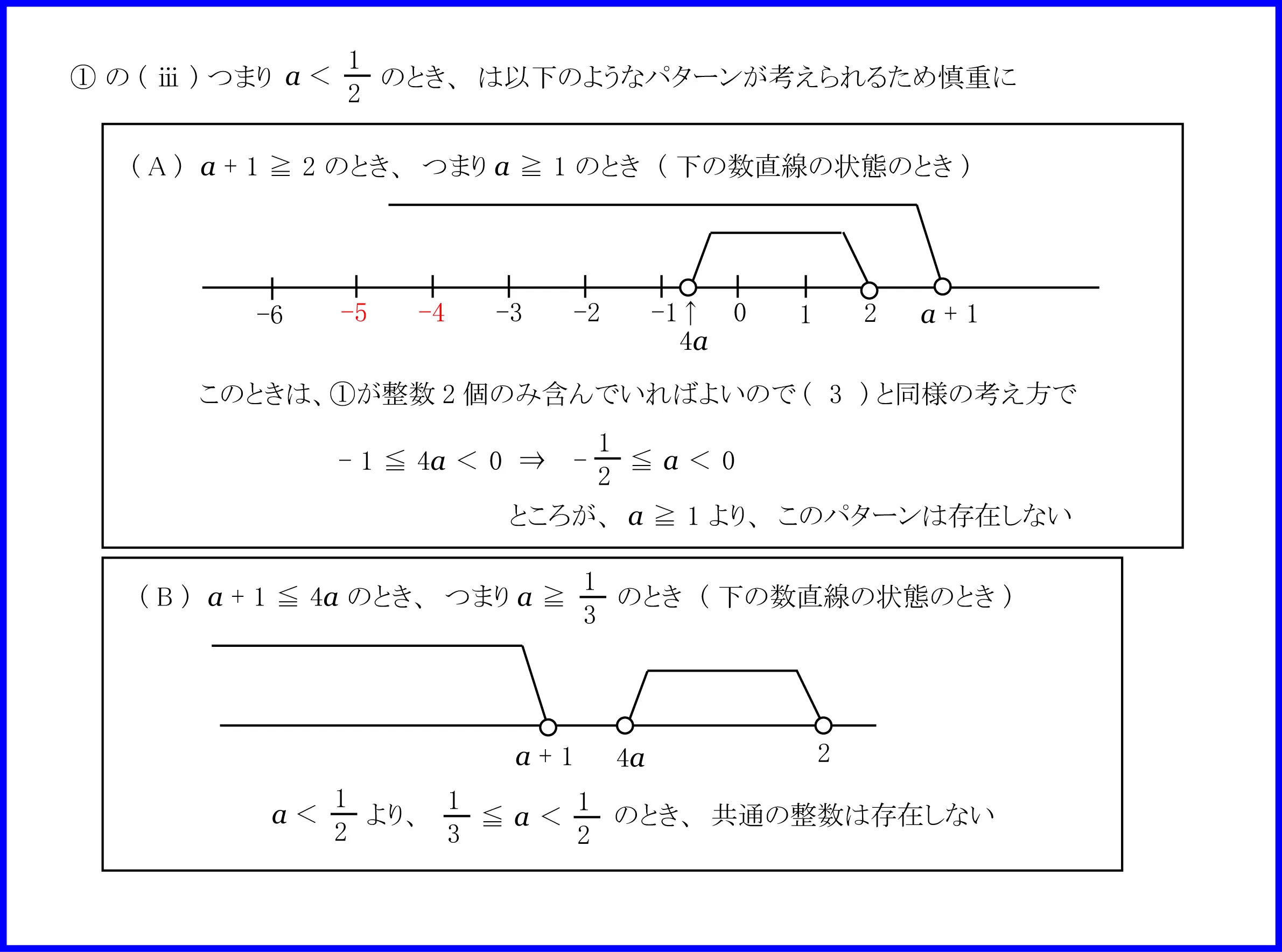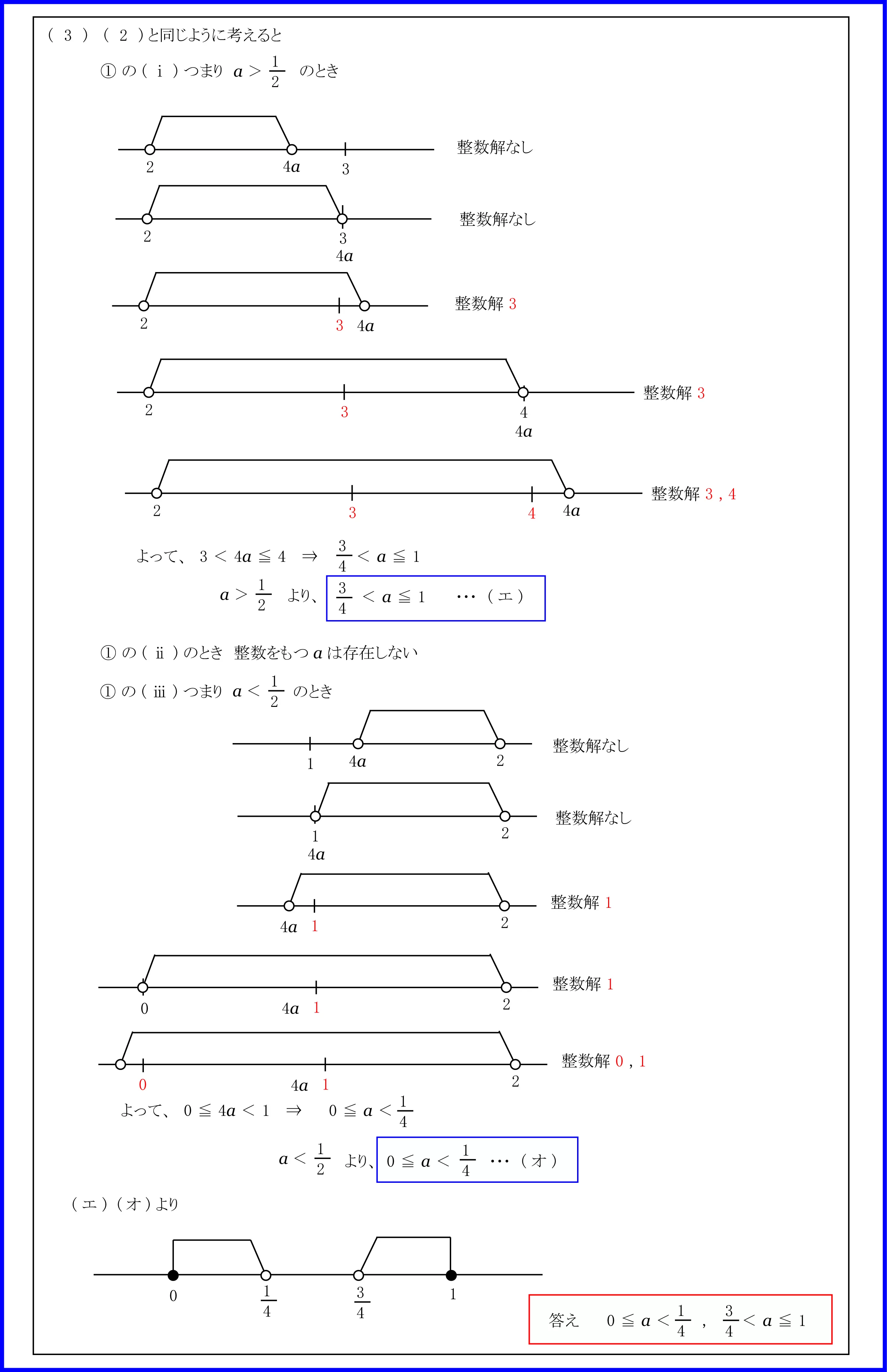 (3)①を満たす整数が1つだけあるとき,aのとりうる値の範囲は,