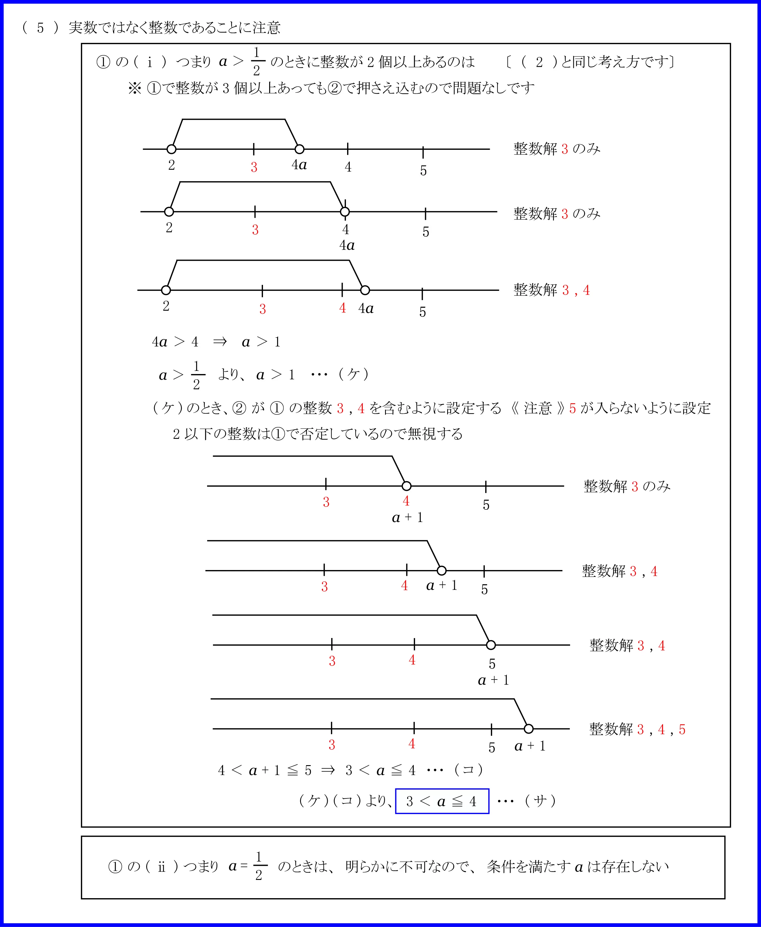 (5) ① ② をともに満たす整数æがちょうど2つあるとき, αのとりうる値の範囲は、