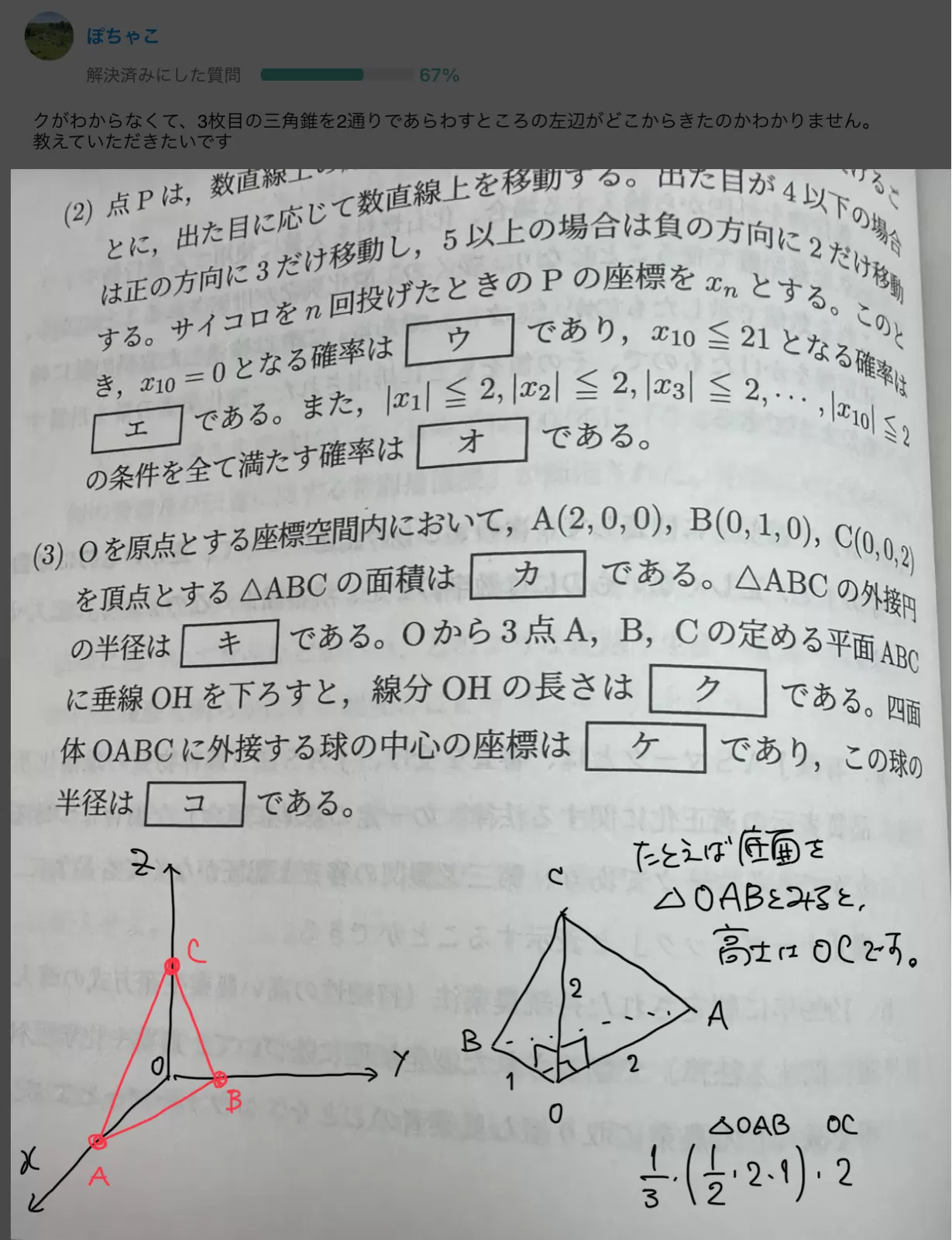 (3) Oを原点とする座標空間内において, A(2,0,0), B(0,1,0), C(0,0,2