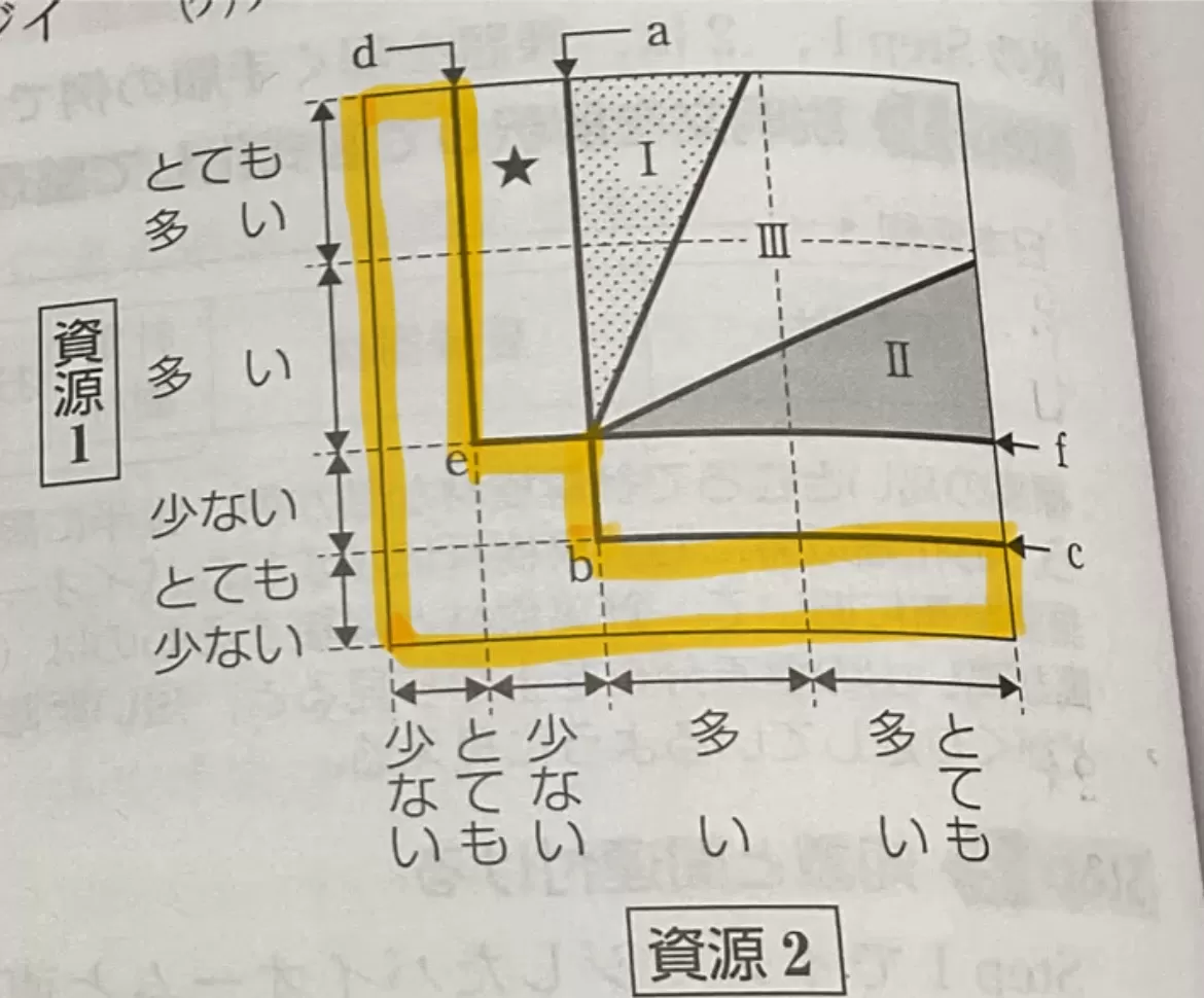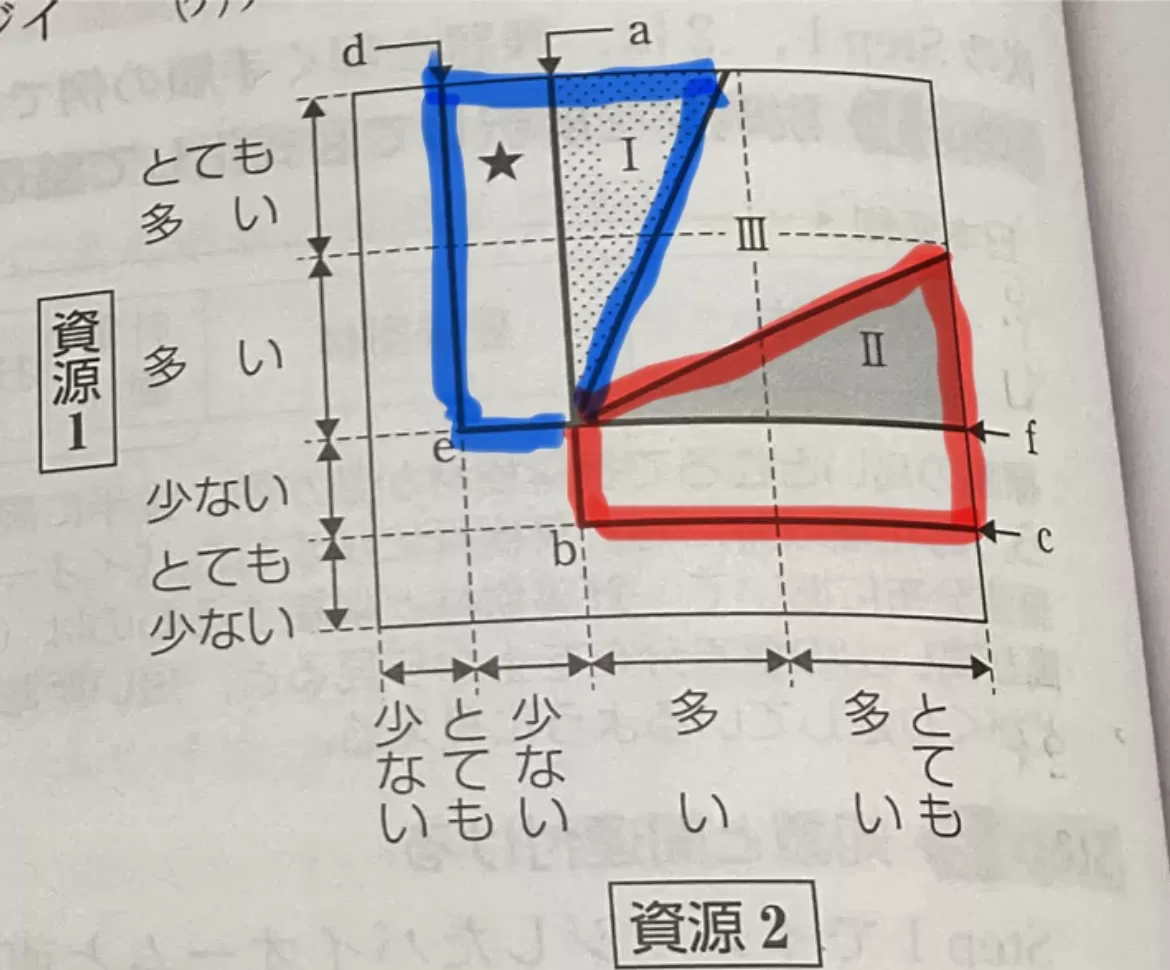 ②問題文に「一方の種は図中の境界線abcで…(省略)…それぞれ安定に生存できない」という記述がある。このことから、写真(1枚目)の赤で囲った部分が一方の種のみが生存できる範囲、青で囲った部分がもう一方の種のみが生存できる範囲だとわかる。よって②の条件に当てはまるのは、赤で囲った部分と青で囲った部分両方。①と同じように、必ずこの領域に入る資源量の範囲を考えると、片方の資源が「とても多いor多い」でもう片方の資源が「少ない」であればよいとわかるので、答えは(イ)(ウ)。