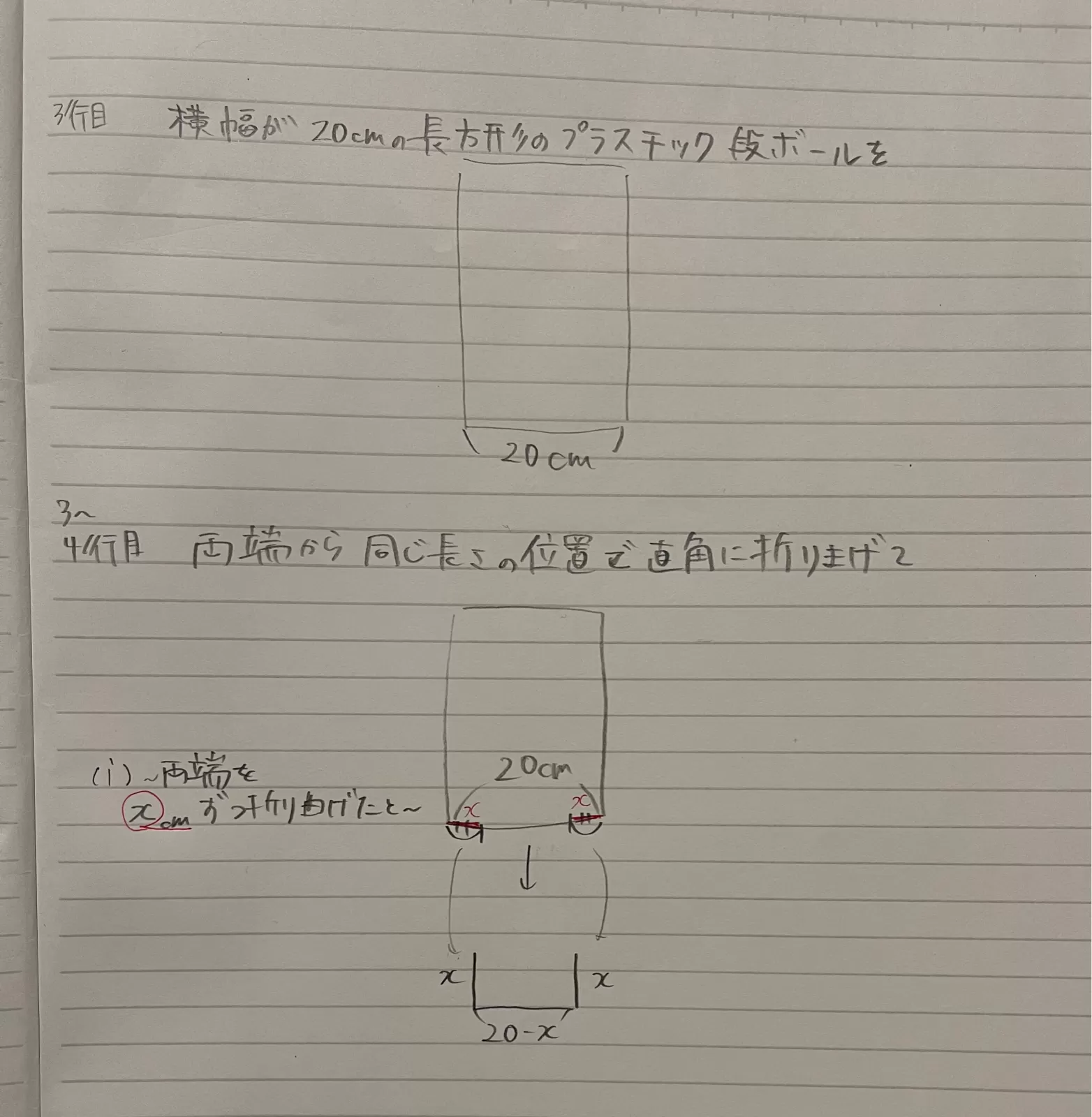 すみません、どこがXなのかをよく理解できていなくて、私はBCの長さが20ー2Xなので端のところがXで縦はどう表すかわかっていなかったのですが、