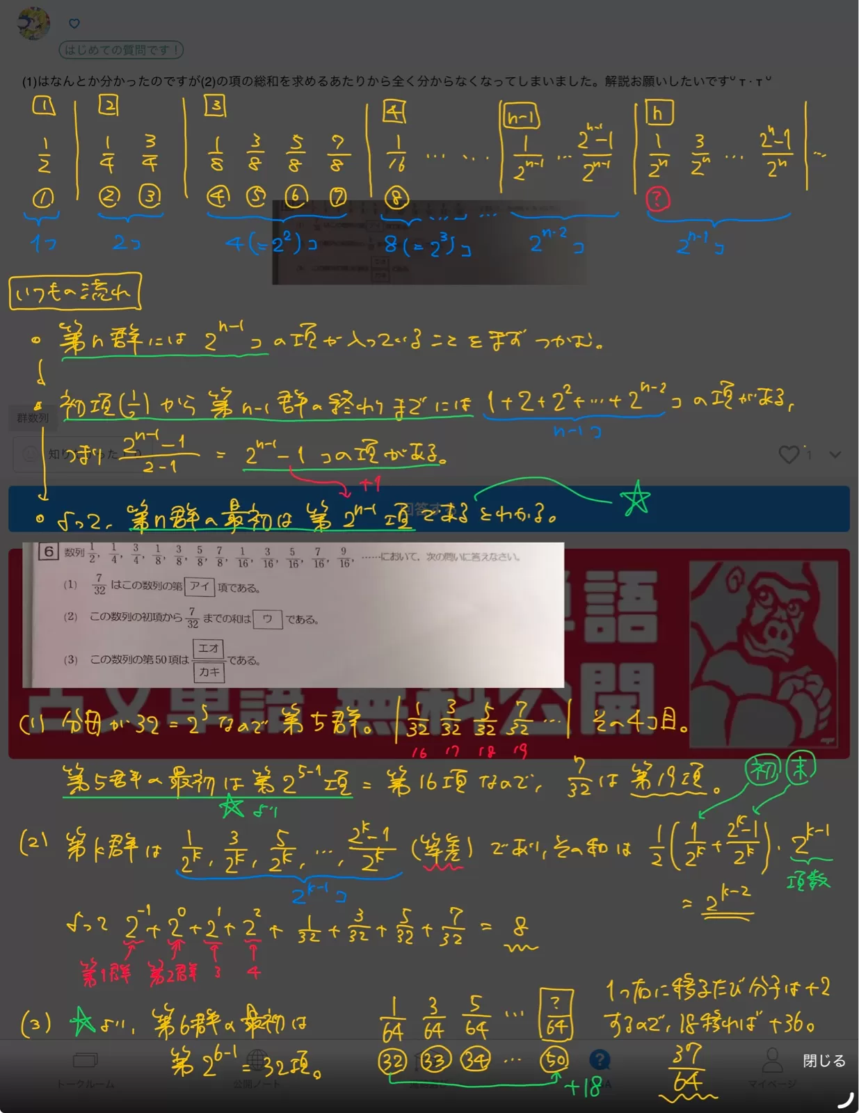 (1)はなんとか分かったのですが(2)の項の総和を求めるあたりから全く分からなくなってしまいました。解説お願いしたいですᐡ т · т ᐡ