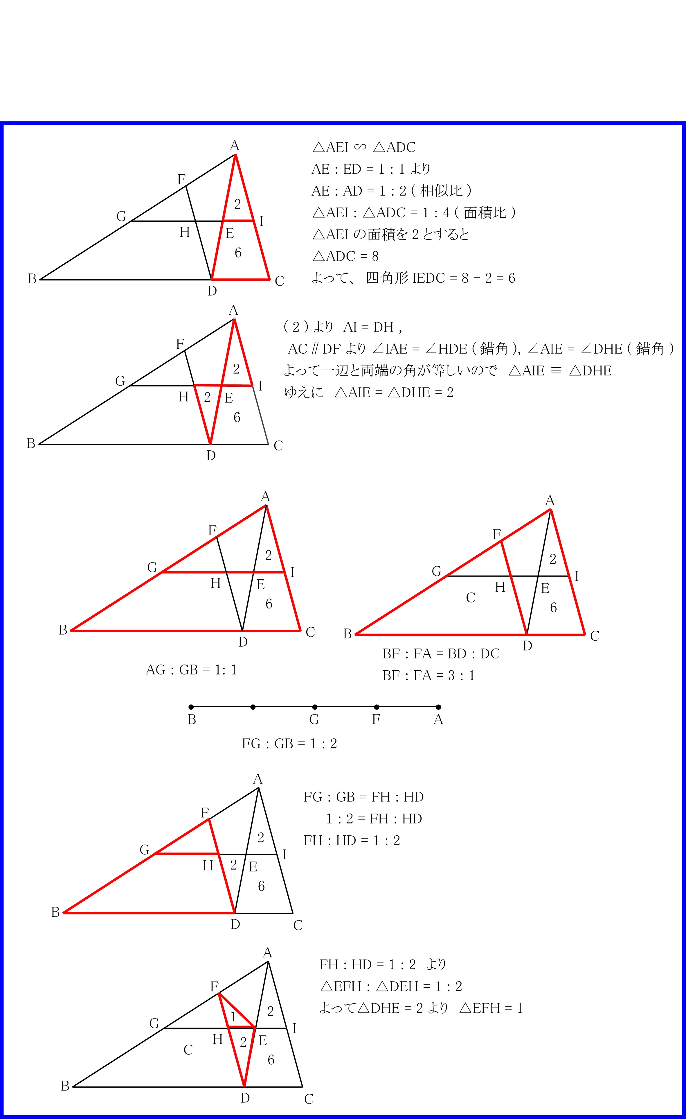 と線分の比の定理を用いると, AG:GB=AI: IC=AE:ED=1:1より, 点G, Iはそれぞれ辺