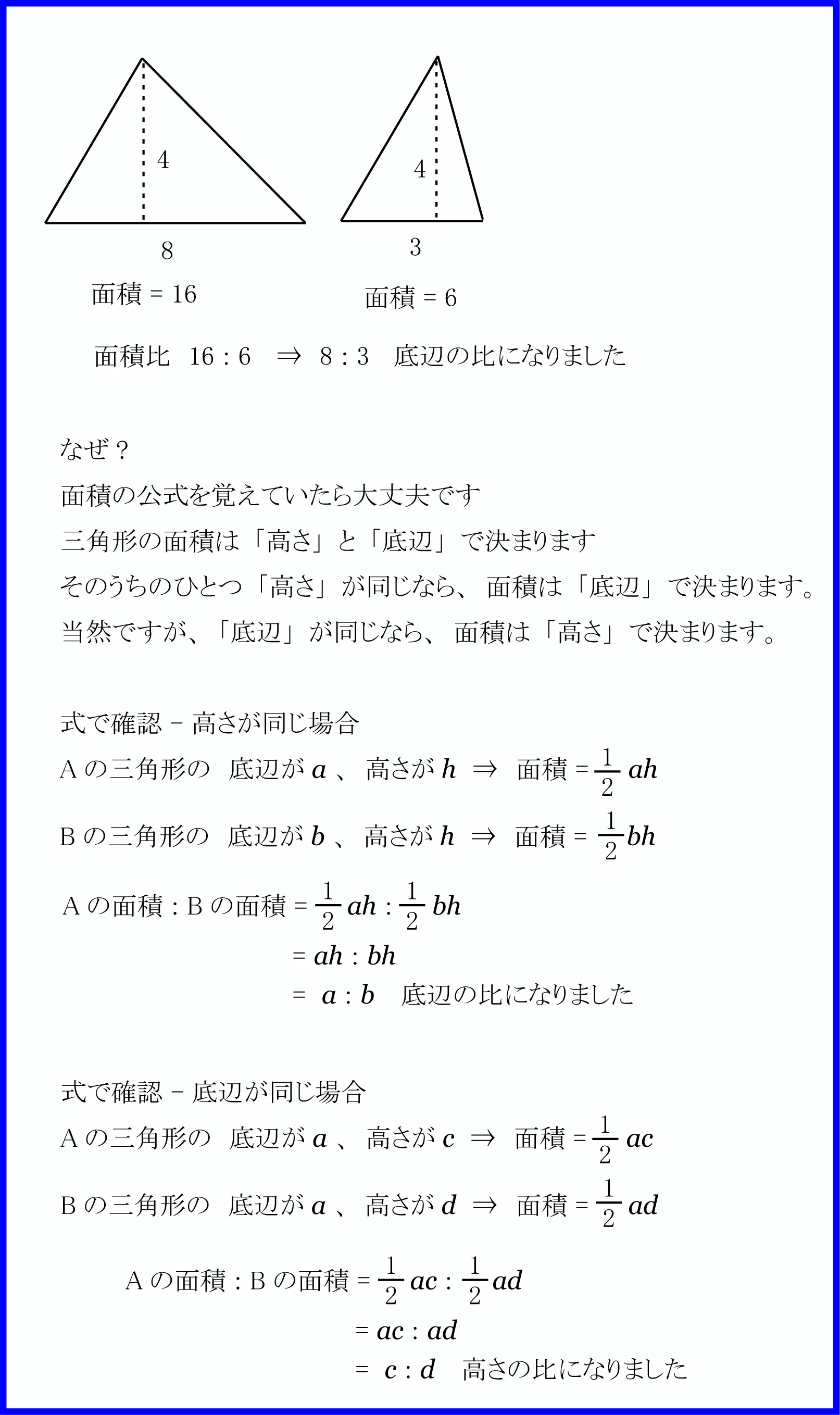 相似でなく、高さ等しいなら底辺の比がそのまま面積比になるのですか?