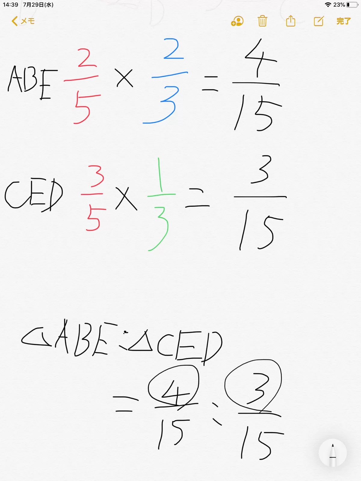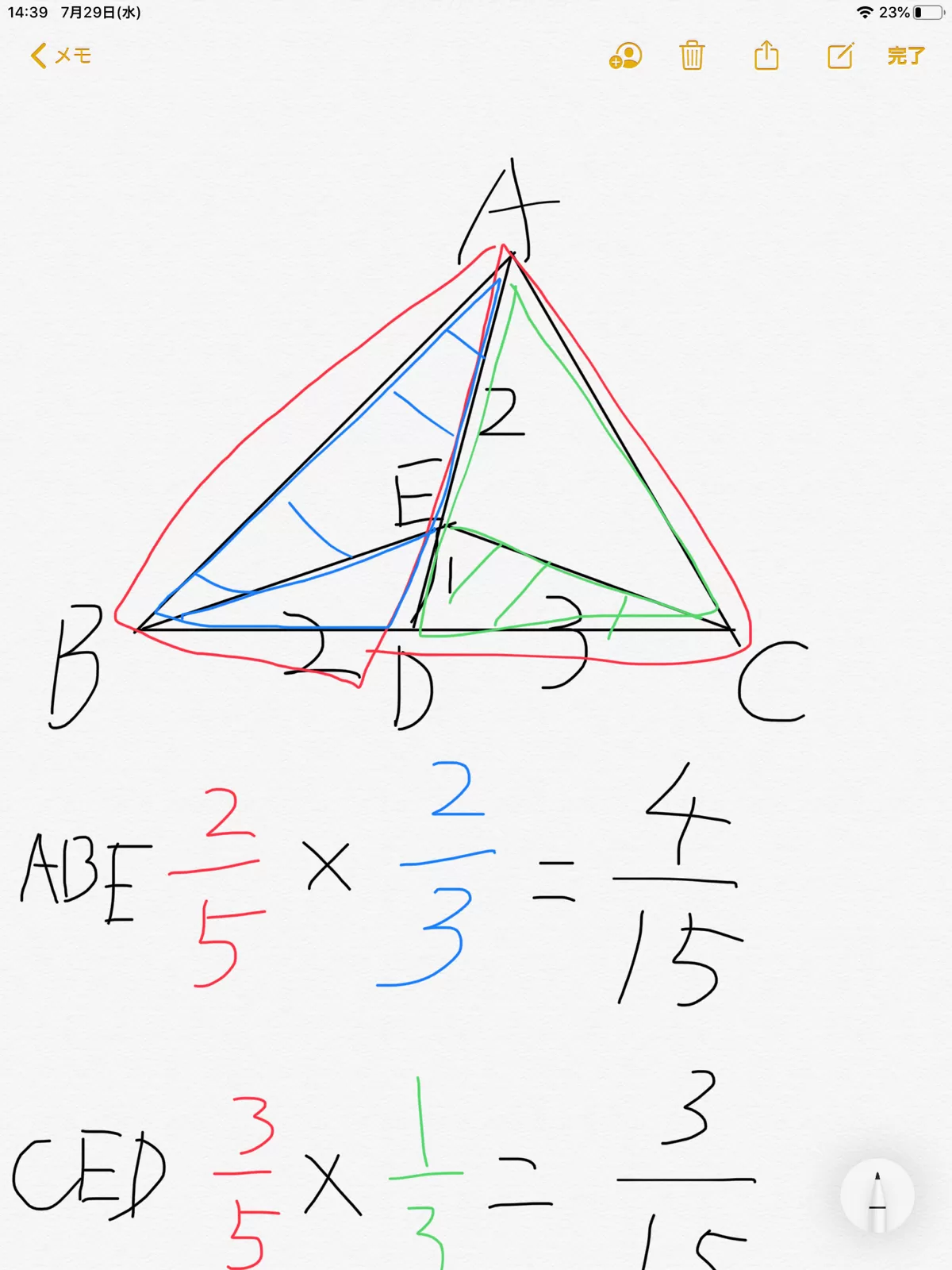 自分も上の人と同じ4:3になったのでやり方違うかもしれませんが、説明します。まず、🔺BDEと🔺CDEを見ます。そうするとEDが共通なので高さを比べ🔺CDEれば分かります。そうすると🔺BDE:🔺CDE=BD:DCより 2:3…①となります。次に同じ作業を🔺BDE:🔺ABEで行います。自分でやってみてください(分からなかったら連絡下さい👍)そうすると🔺BDE:🔺ABE=1:2…②が出てきます。①、②より🔺BDEが共通なので、比を合わせてあげると、4:3が出てきます。こんな感じです。まだ分からなかったら連絡下さい👍お互い勉強頑張りましょう❗️