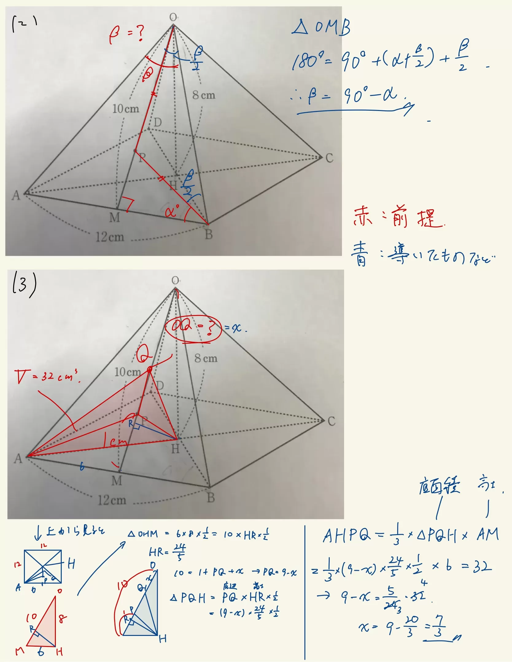 (3) 三角錐AHPQの底面を△APQとみるときの高さは,点Hから線分OMにひいた垂線と