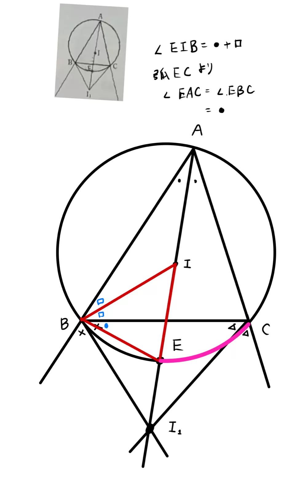 問二の証明中に∠EBI=∠EIBというのがでてきますが理由が分からないです。前回同じ質問をして弧の長さが同じだからと言われましたが見つかりません