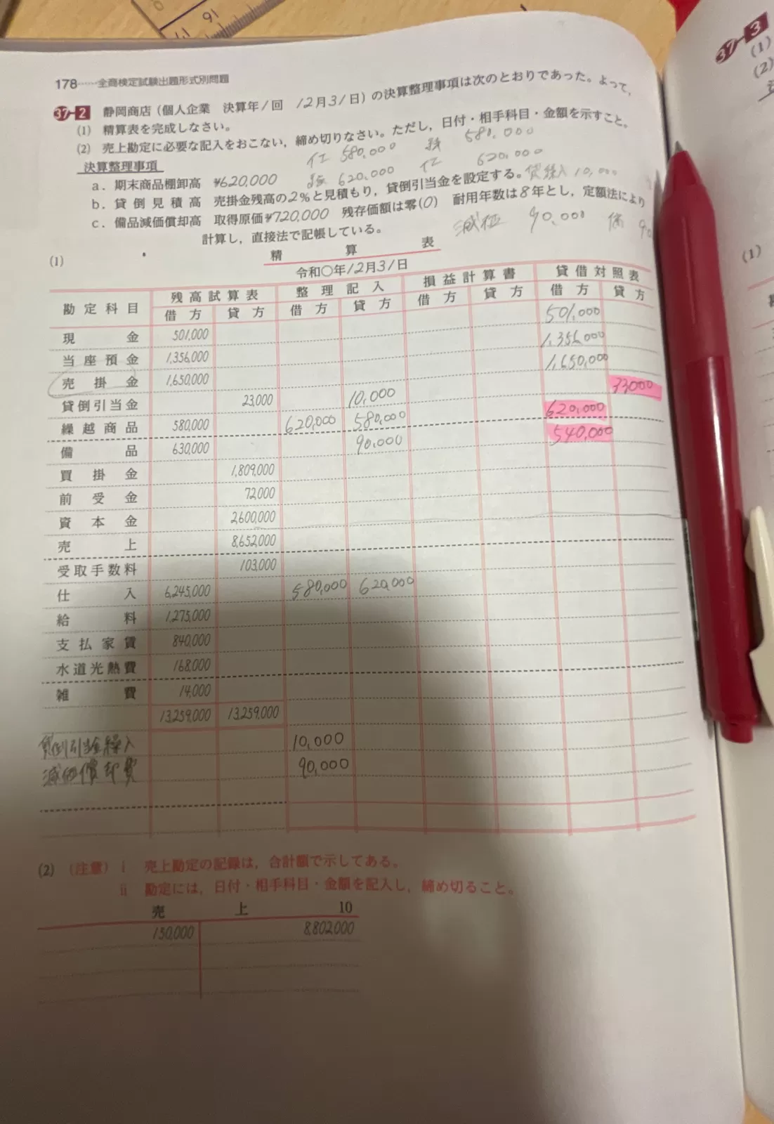 (貸倒引当金)売掛金に対して2%なので33,000円になるようにします。現在23,000円あるので、10,000円補充して、貸借対照表に33,000円貸方計上します。