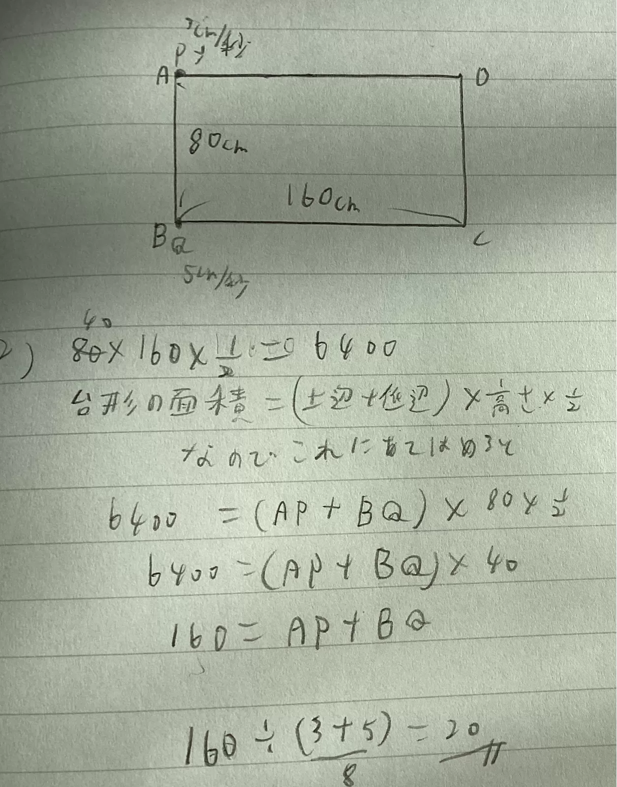(2) 台形ABQP の面積が長方形ABCDの面積の半分になるのは出発してから何秒後ですか。
