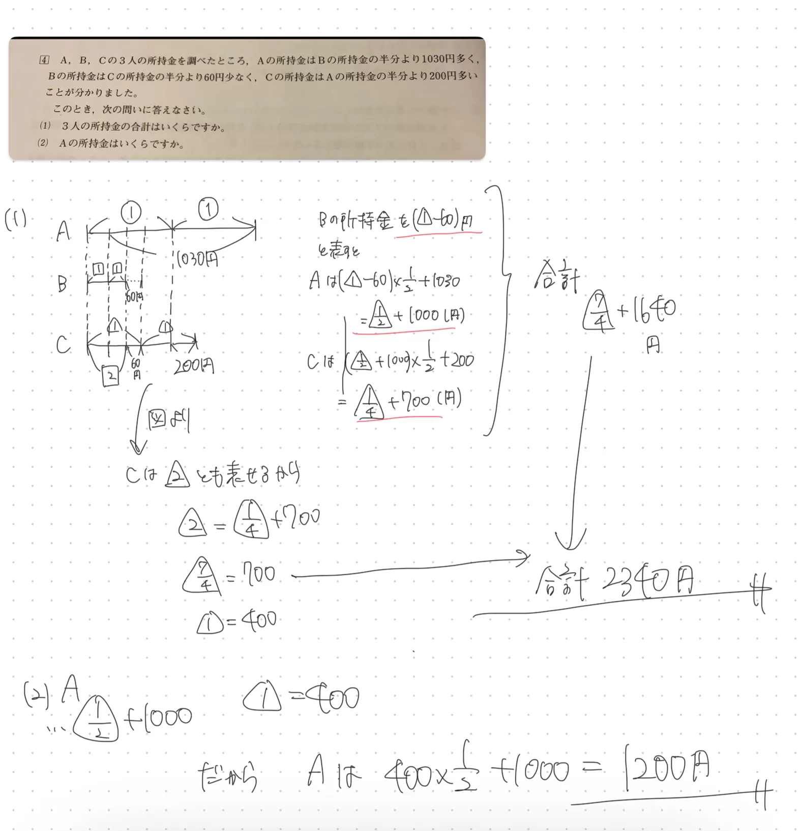 Bの所持金はCの所持金の半分より60円少なく, Cの所持金はAの所持金の半分より200円多い