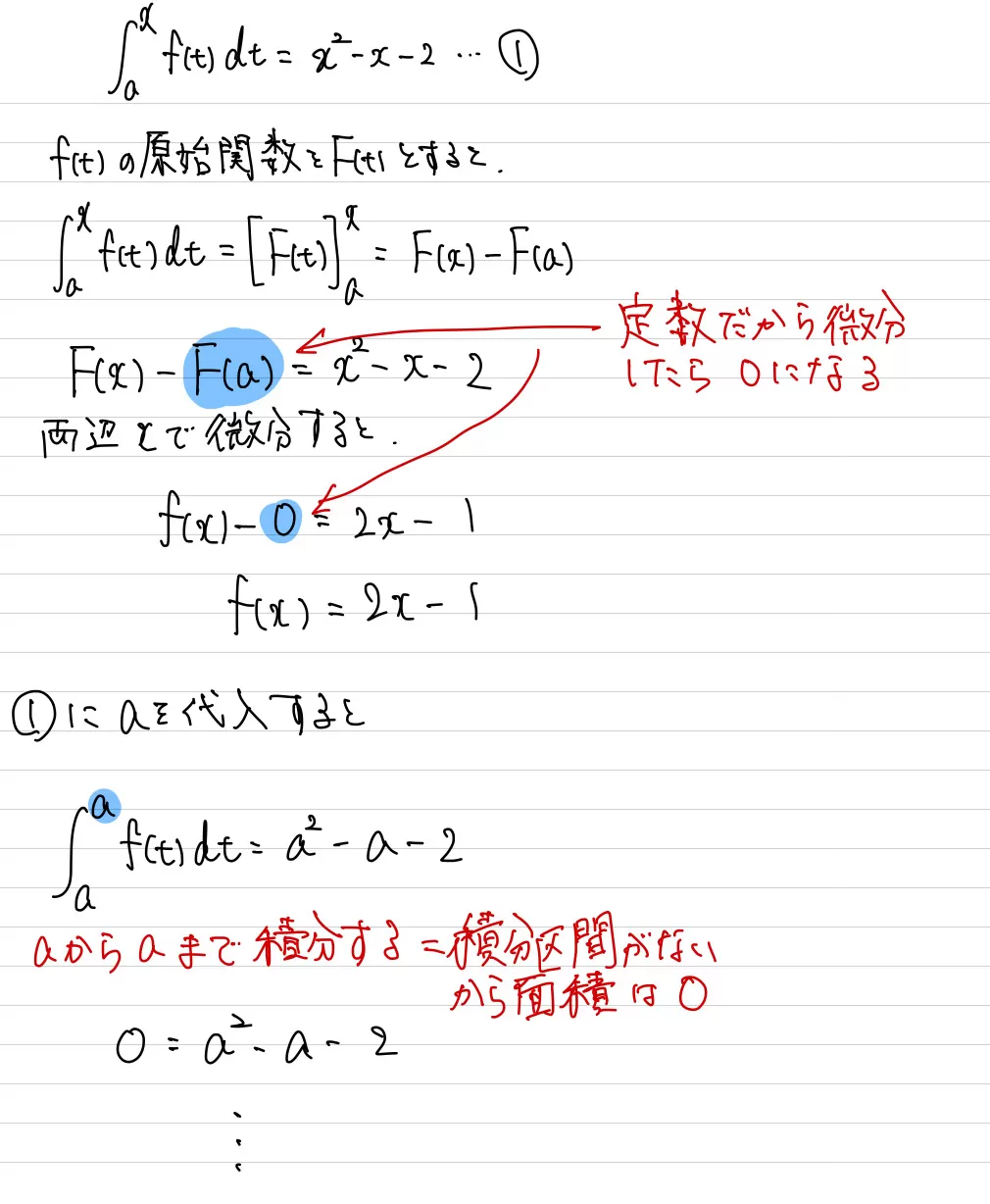 次の等式を満たす関数f(x)と定数aの値を求めよ