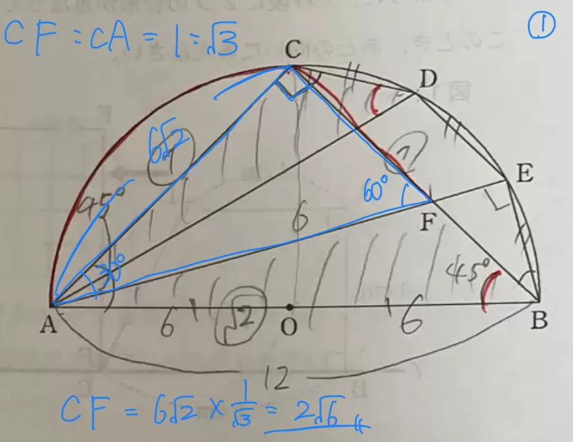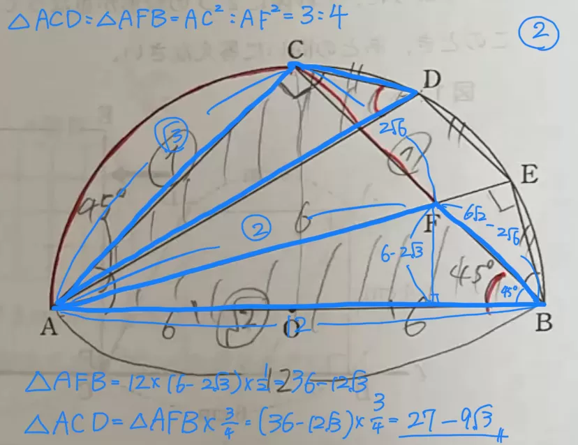 (2) AB=12cm, ∠CAB=45° とするとき, 次の問いに答えなさい。