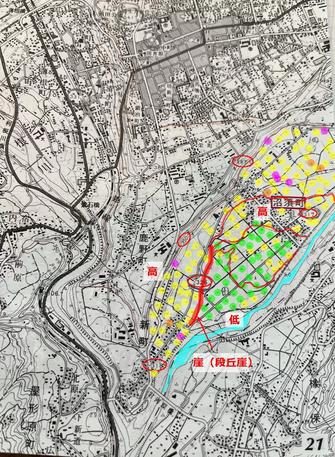「低」と、左側の「高」の間にあって、赤い太線でなぞっているのが崖です。当然、川のある方が低くなっています。