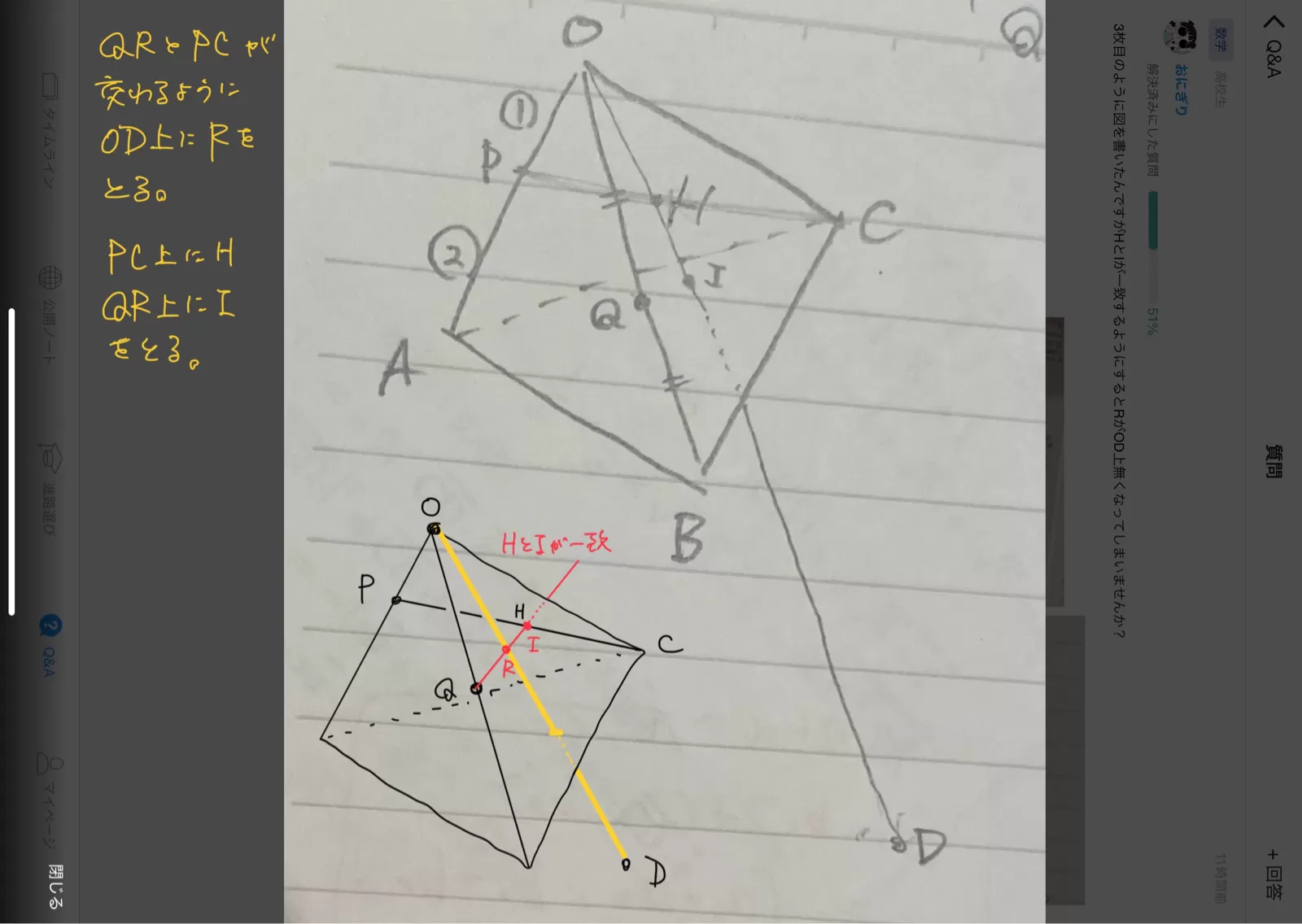 3枚目のように図を書いたんですがHとIが一致するようにするとRがOD上無くなってしまいませんか?
