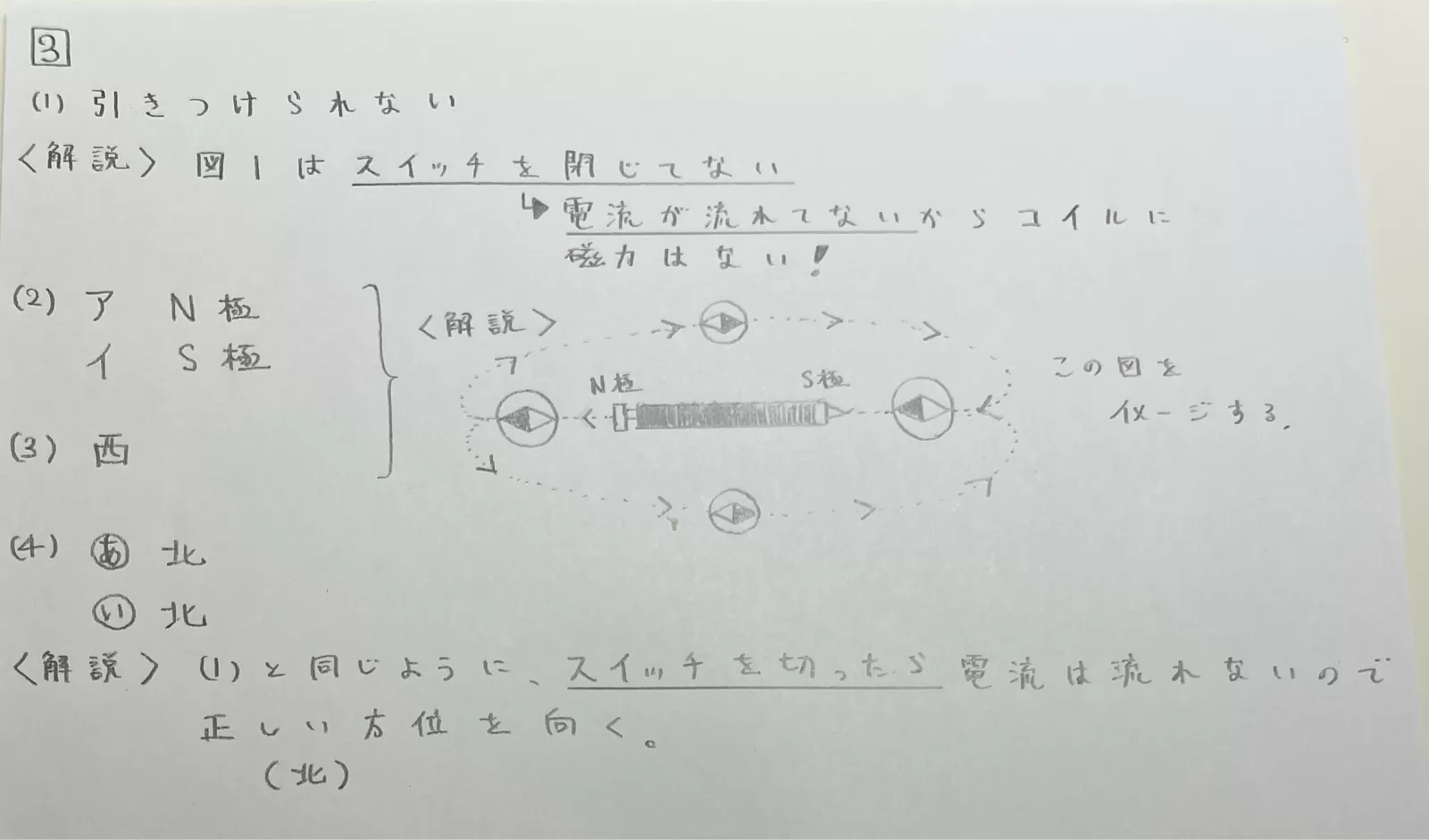 (3) イはS極だから、 N極が西をさす。