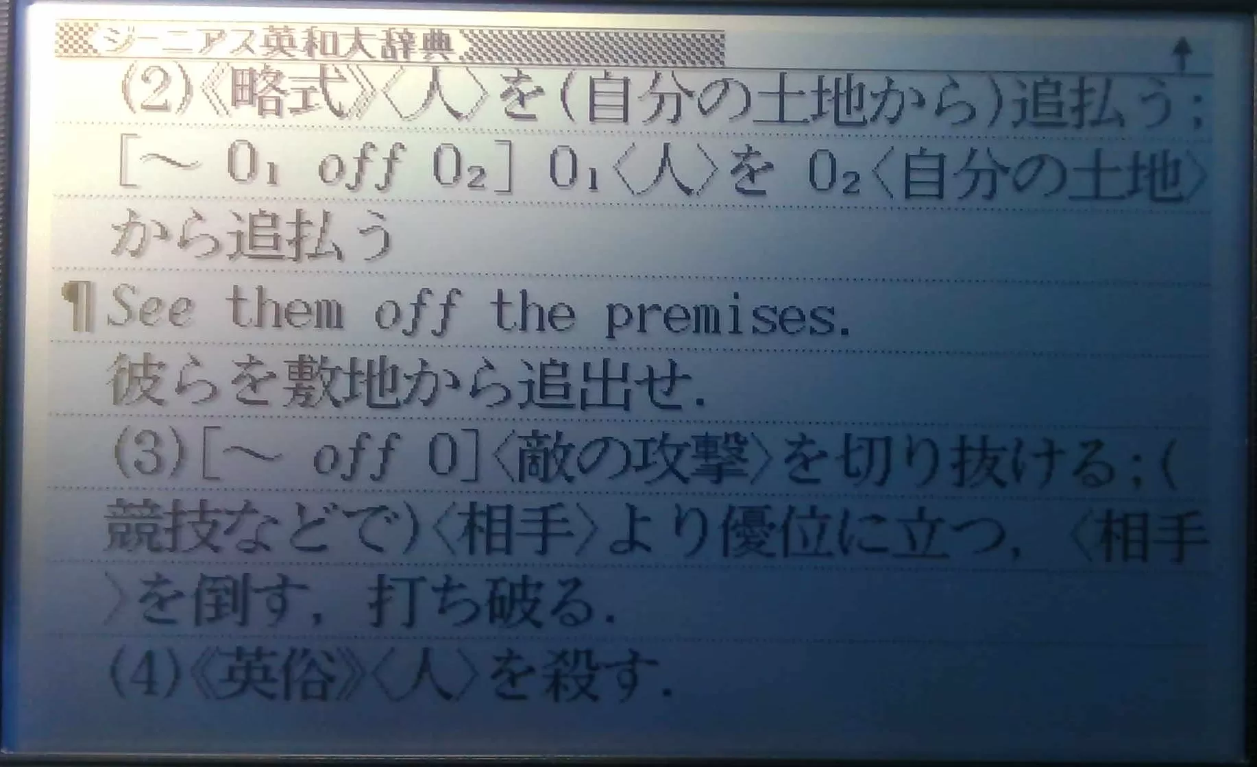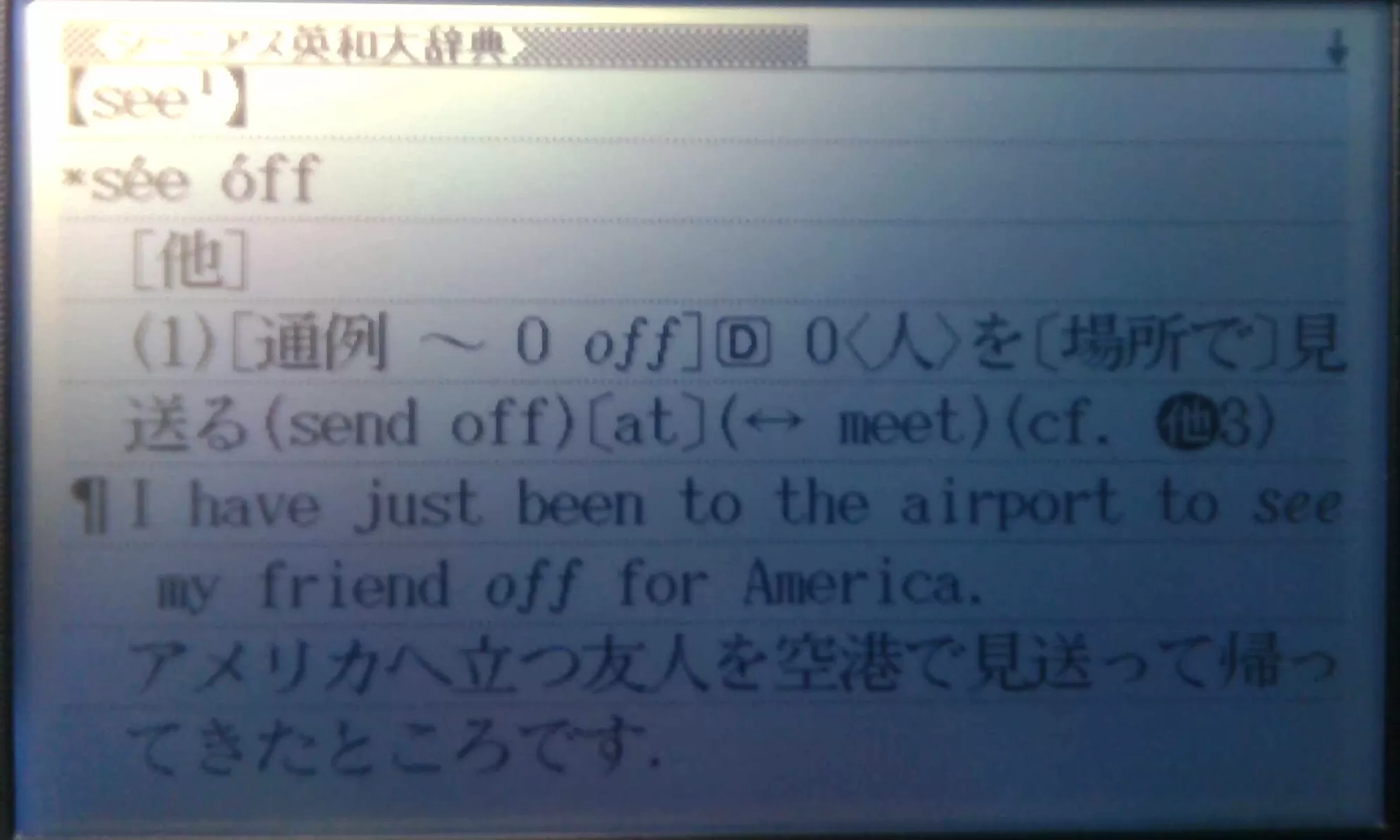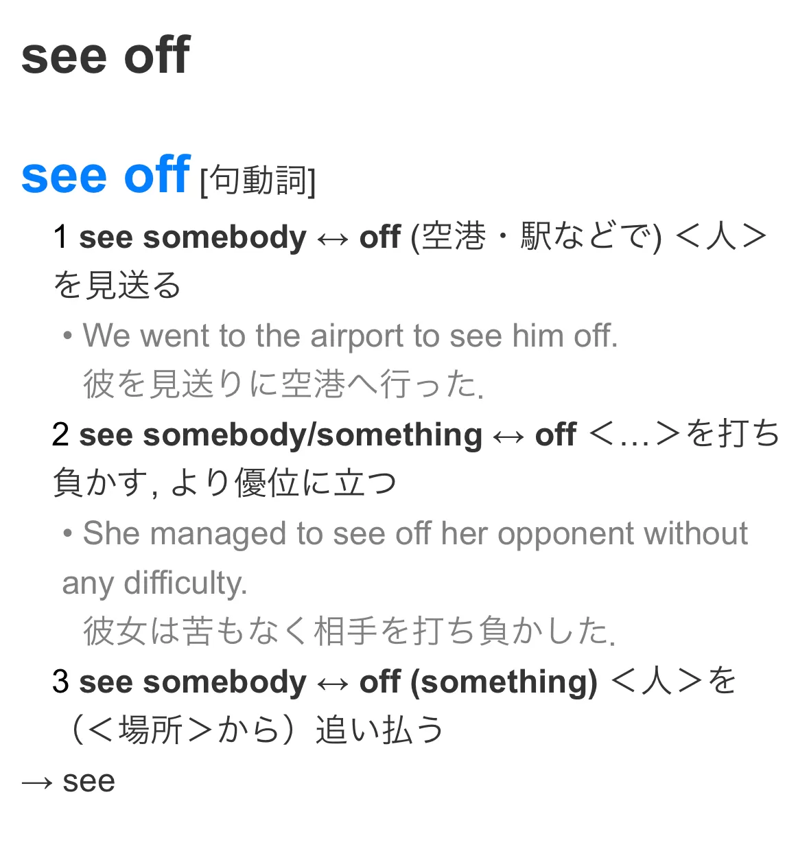 >しかし、辞書を引いて見るとsee offは目的語が入る位置に因って意味が異なるようなんです。
