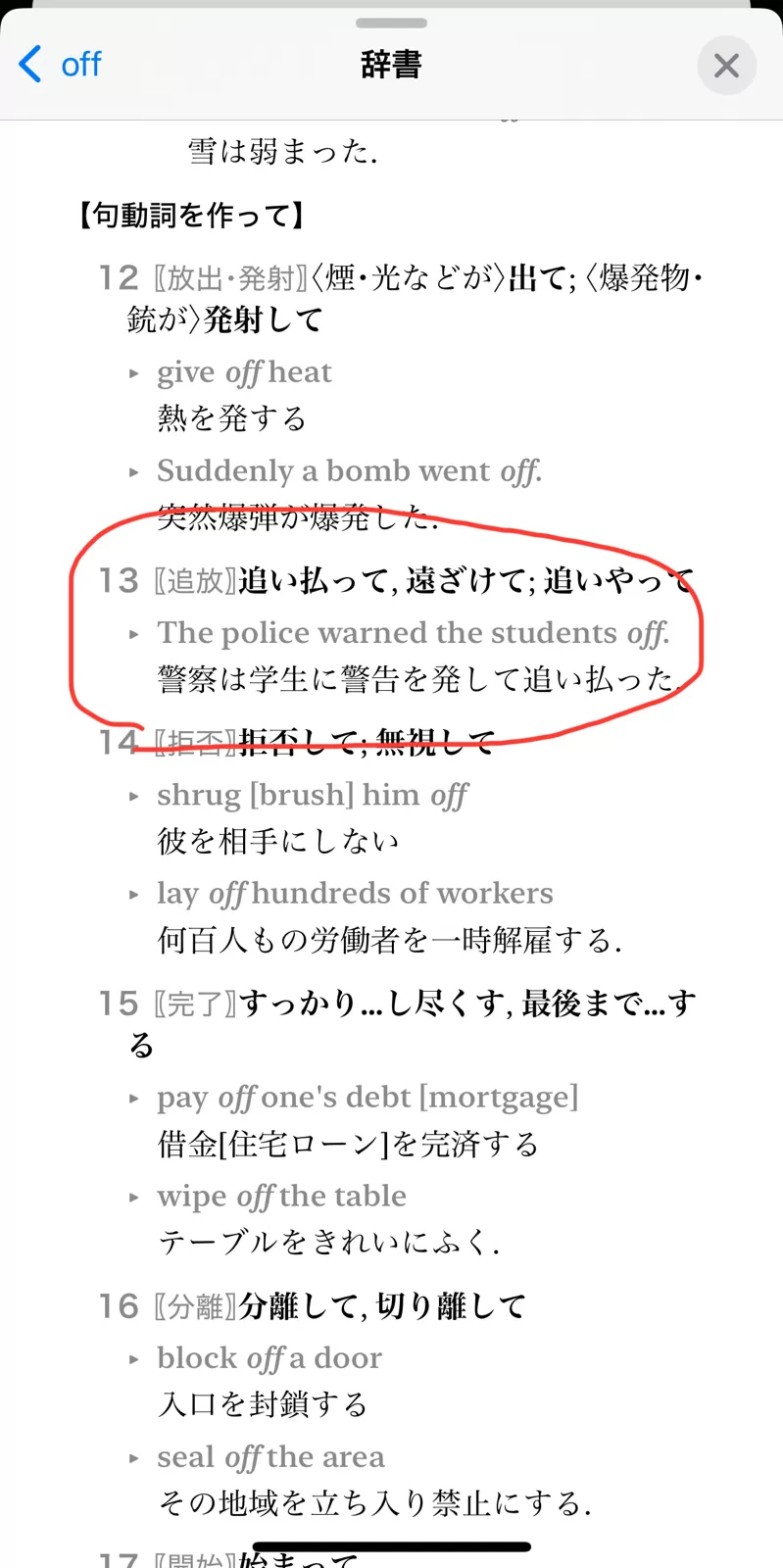 ちなみに、副詞のoffを辞書で調べると