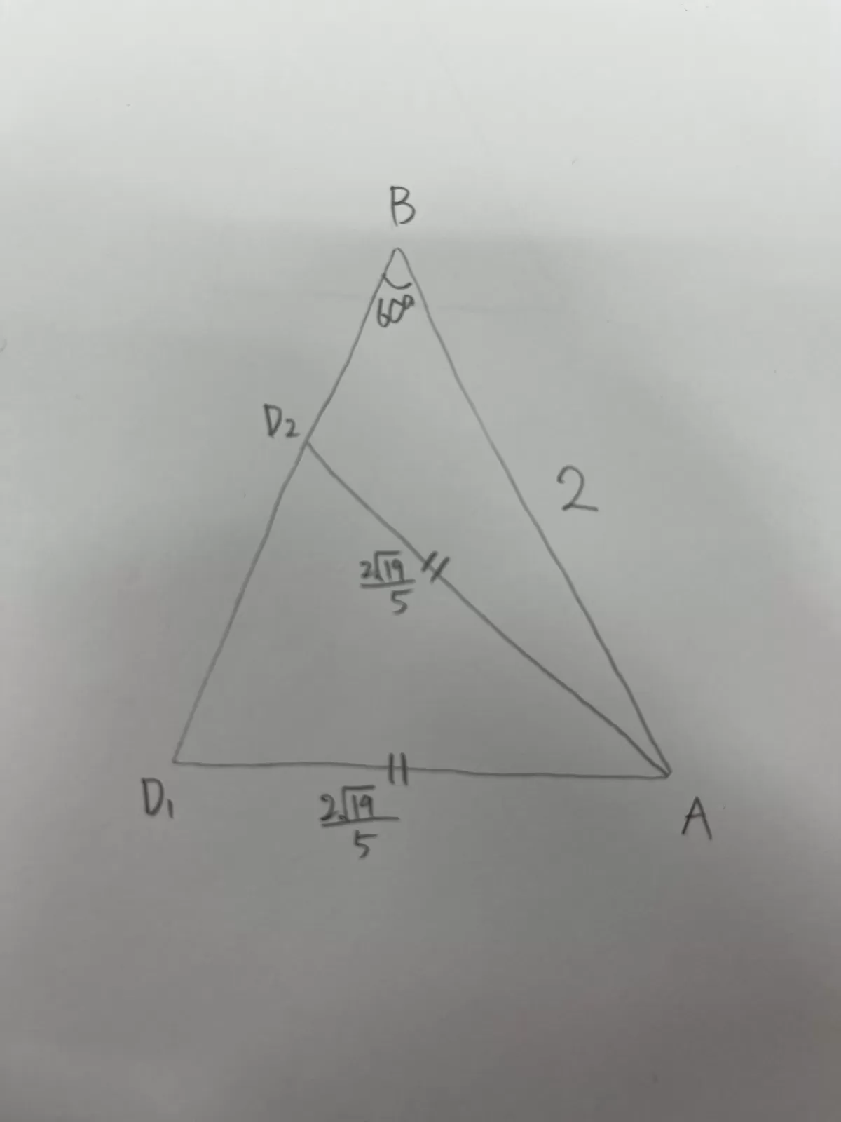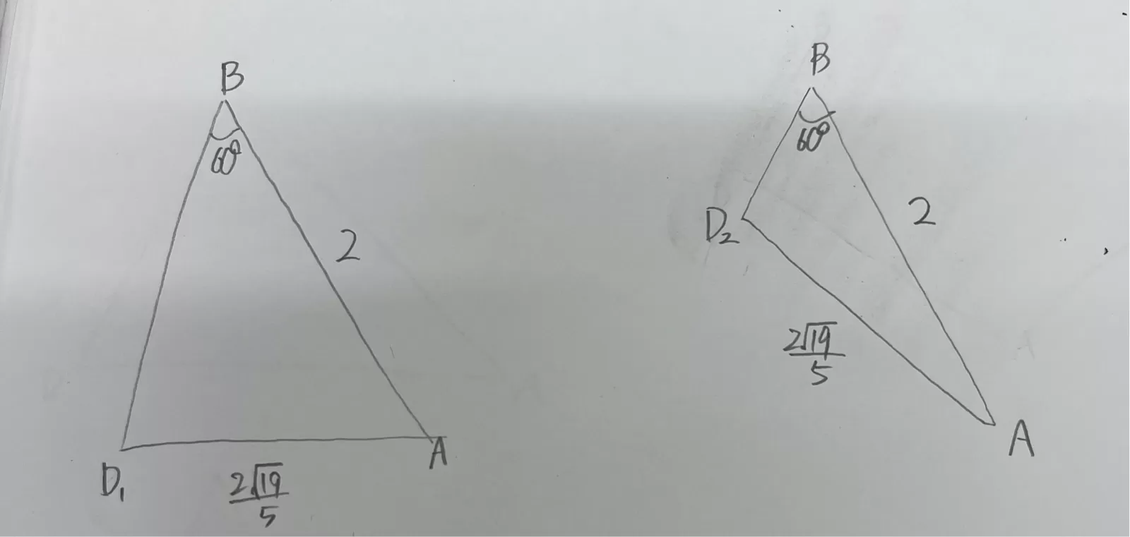 AB=2, AD=2√19/5 ,∠ABD=60° この3つのみで考えていたと思います。これらを満たす三角形は2つ存在してそれが写真の通りになります。