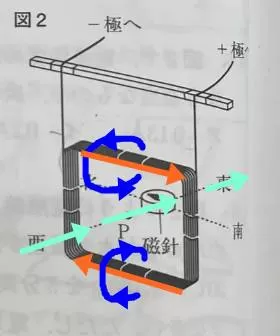 ①オレンジの向きに電流、青色の向きに電流による磁界ができているので、P点を通る磁界は水色の向きにできていますので、方位磁石はN極は東を向く
