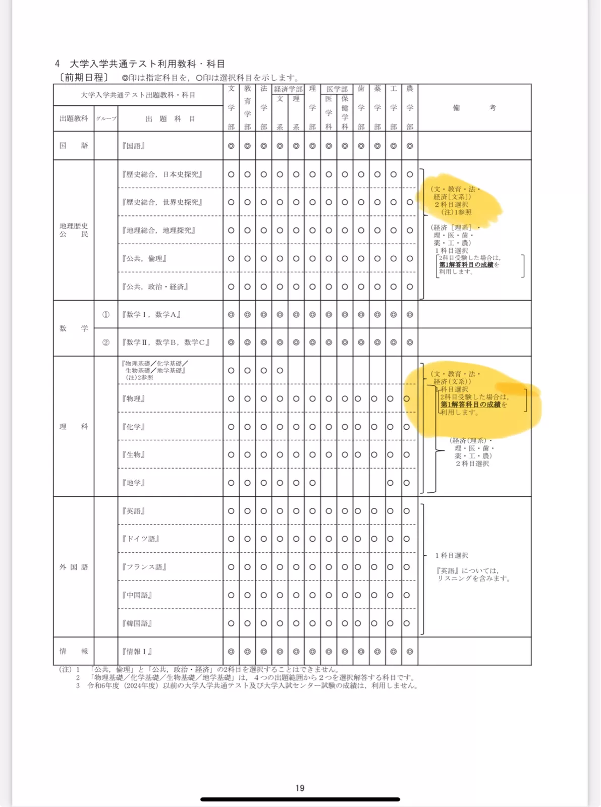 ありがとうございます。そうなのですね。例えば写真は東北大学の受験科目なんですが(まだ私も地方の国公立に進むか、難関の国公立に進むか決めてないのですが)、この場合、文系の人でも、理科基礎は2科目受けなくてはいけないということでしょうか。先ほど、60分全てを生物基礎に費やして満点をとって、化学基礎を出したら、50点になるとの事でしたが、いずれにせよ、第一解答科目しか採点されないのなら、50点が満点と言う認識だったのですが、違うのでしょうか?また、理系の生徒が基礎がついていない方の理科を2科目受けるとして(文系の人なら社会)、仮に生物と地学を選んだとします。(文系の場合は、日本史と世界史)。この場合、第一回答科目しか採点されないのであれば、生物の欄だけ埋めて、地学の欄は白紙ということですか?(文系は日本史だけ埋めて、世界史は白紙)。それなら、仮に2科目選択でも実際には1科目しか勉強しなくてもいいんですか?よく理解できていなくて申し訳ございません。