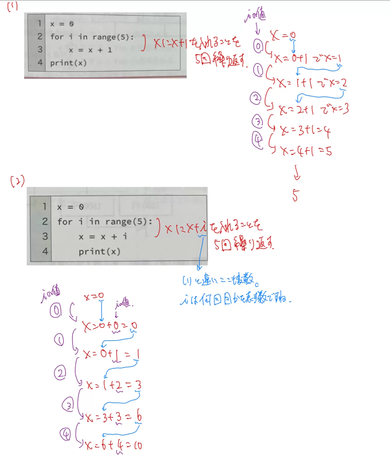 (1)(2)の3行目の「x = x +○」は,「x に○を加えた結果を x に代入する」処理である。 (1)では 「1」を,(2)では「i(1ずつ増え