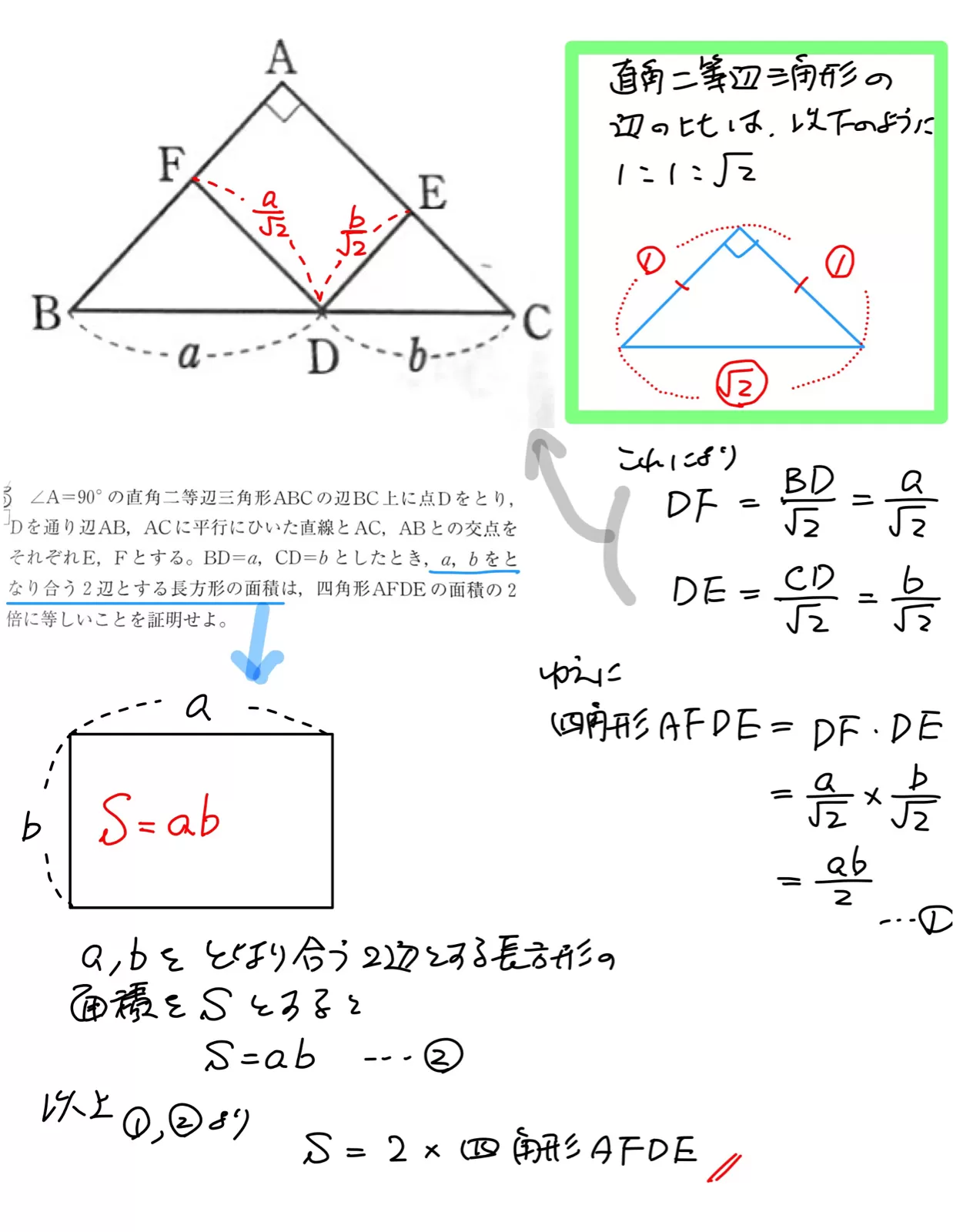 三角比1:1:√2から、FD=a/√2、ED=b/√2