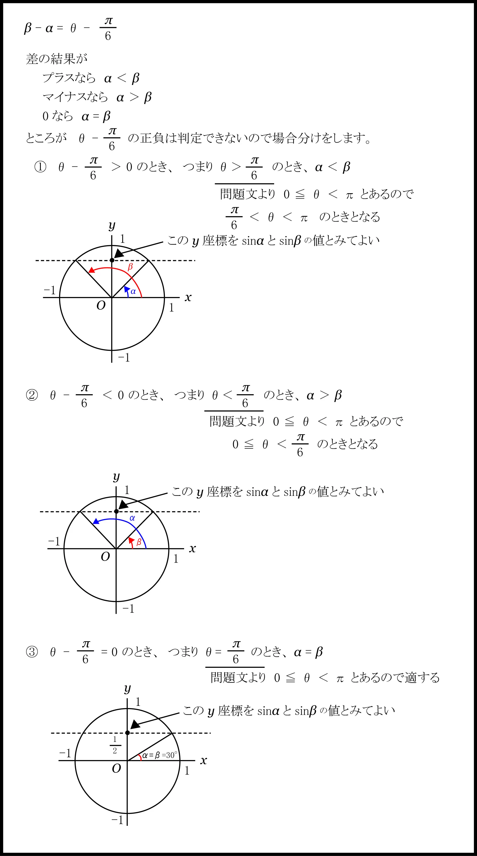 sinα=sinβ となるのは (i)α=β または (ii)β=180°-α の時で、(ii)の場合を考えているので、