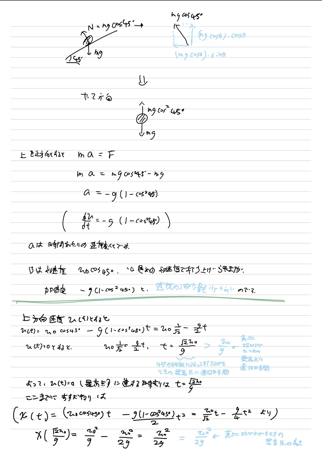 運動エネルギーで考えると確かにそうなんですが、vcos45で投げた様に見えるものは同じ高さに上がるのがおかしいのは、、どこかに考慮漏れがあるのでしょうか?