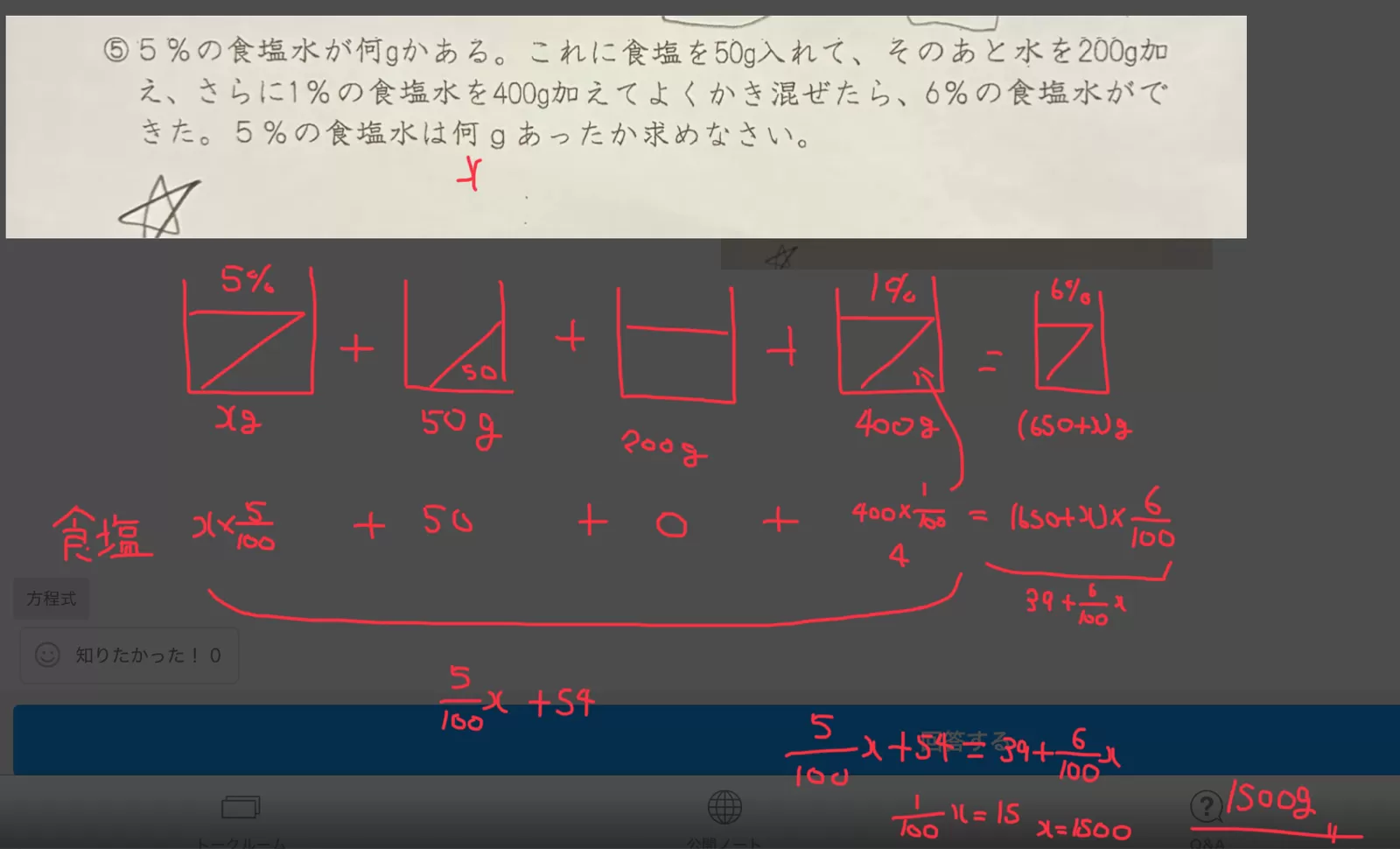 ⑤5%の食塩水が何gかある。 これに食塩を50g入れて、そのあと水を200g加