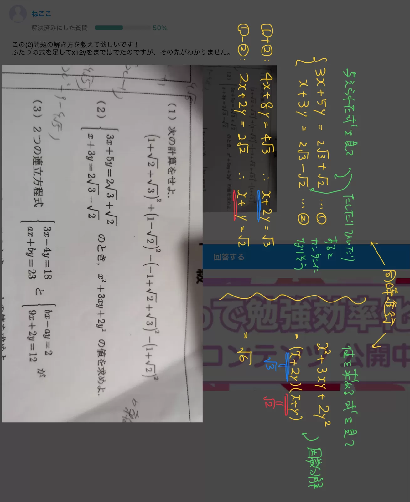ふたつの式を足してx+2yをまではでたのですが、その先がわかりません。