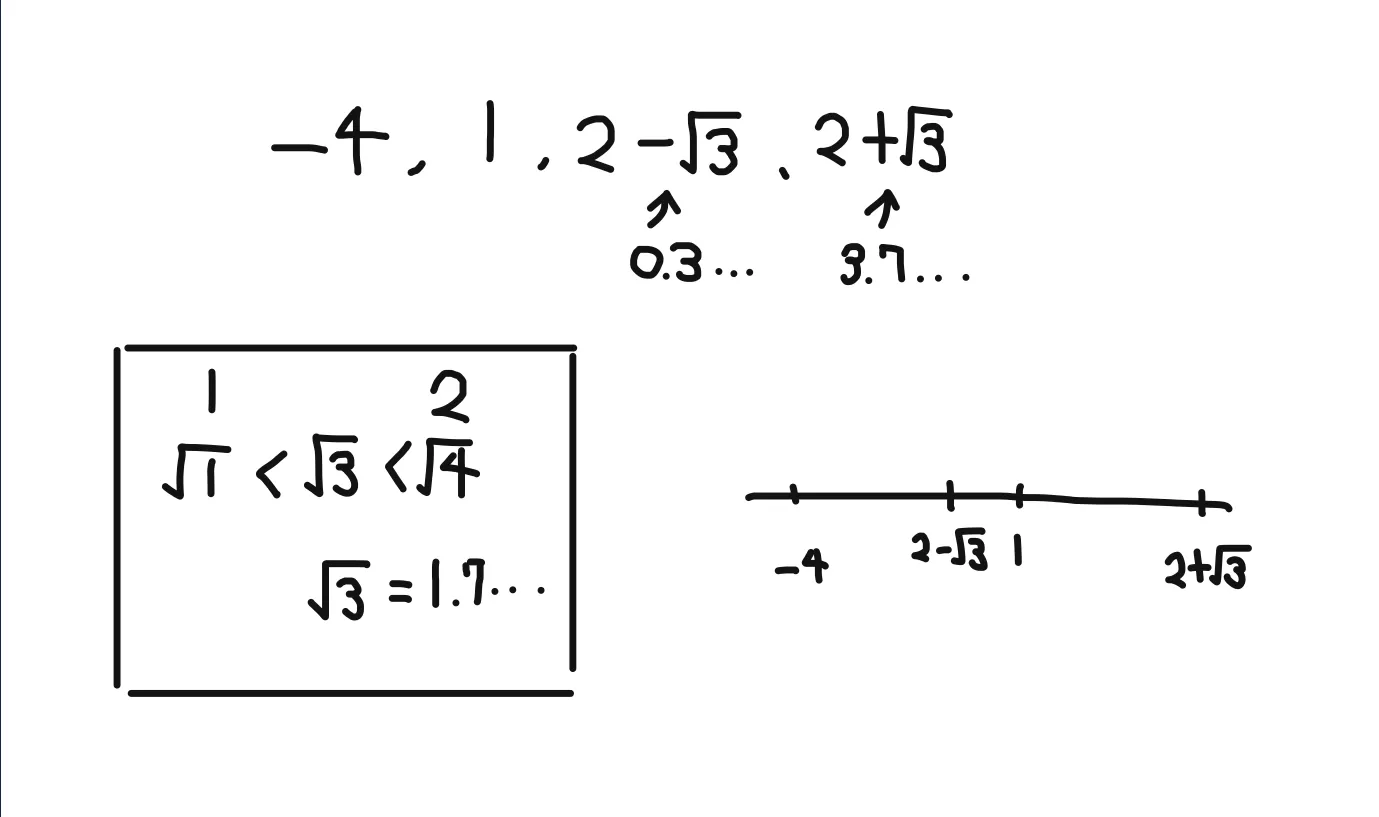 例えば-4、1、2-√3、2+√3の大小関係とか!