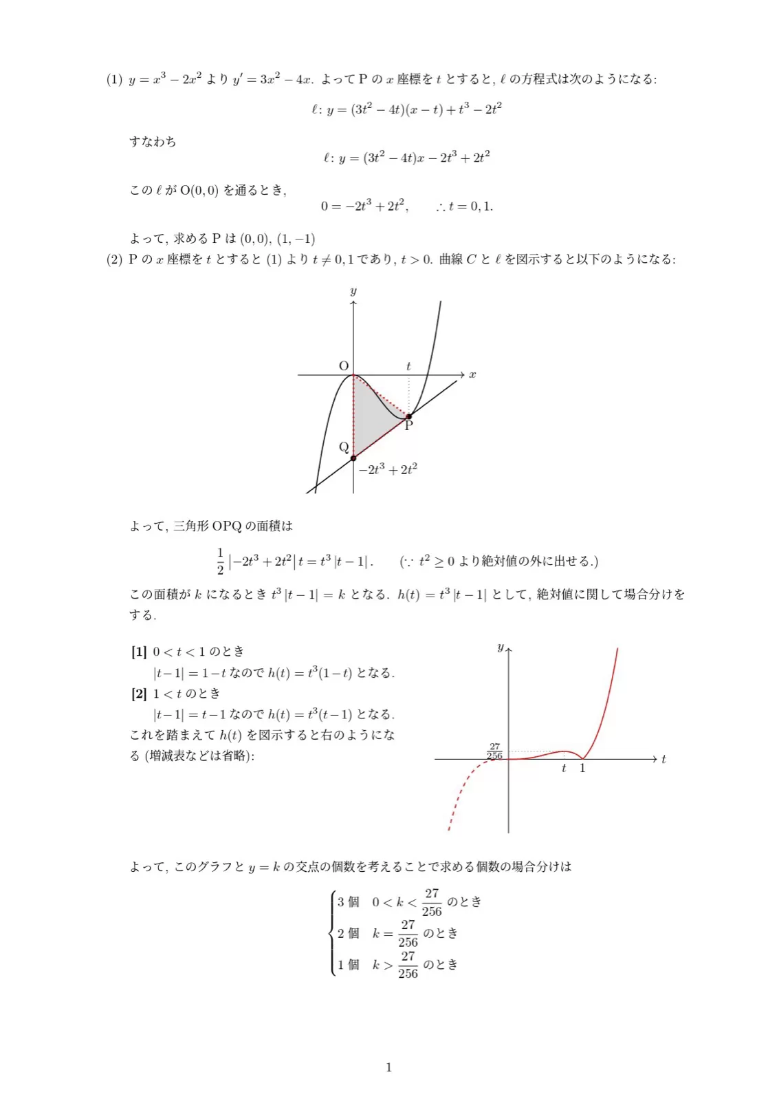 (1)では、途中でt=0,1が出ています。ここまではokですが、その後t=0の場合は原点Oだから不適としています。しかし、原点における接線も問題の条件を満たすので不適とはできません。よって(0,0)と(1,-1)が答えです。