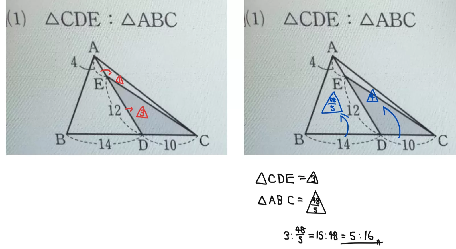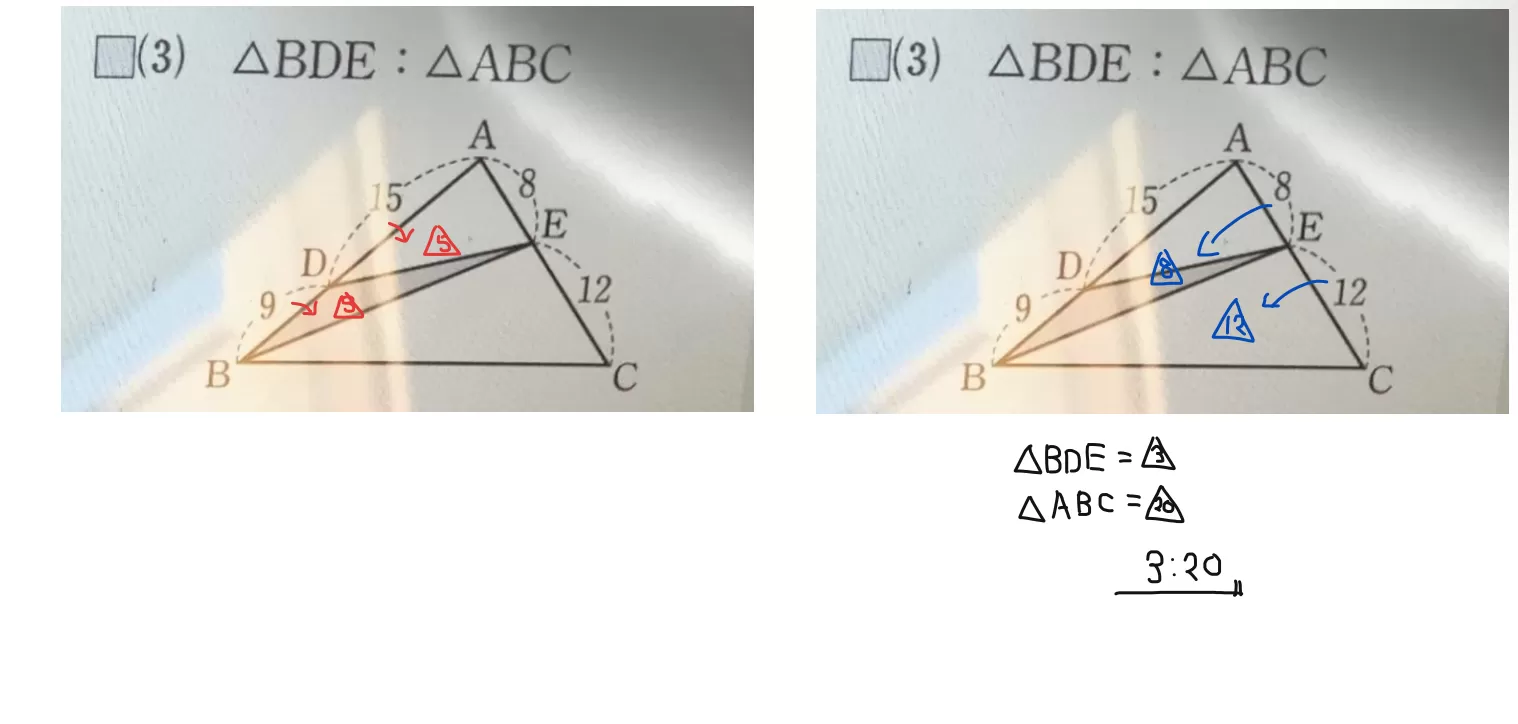 急ぎです。写真のような面積比の問題が分かりません。どの問題でもいいので解き方を教えてください。