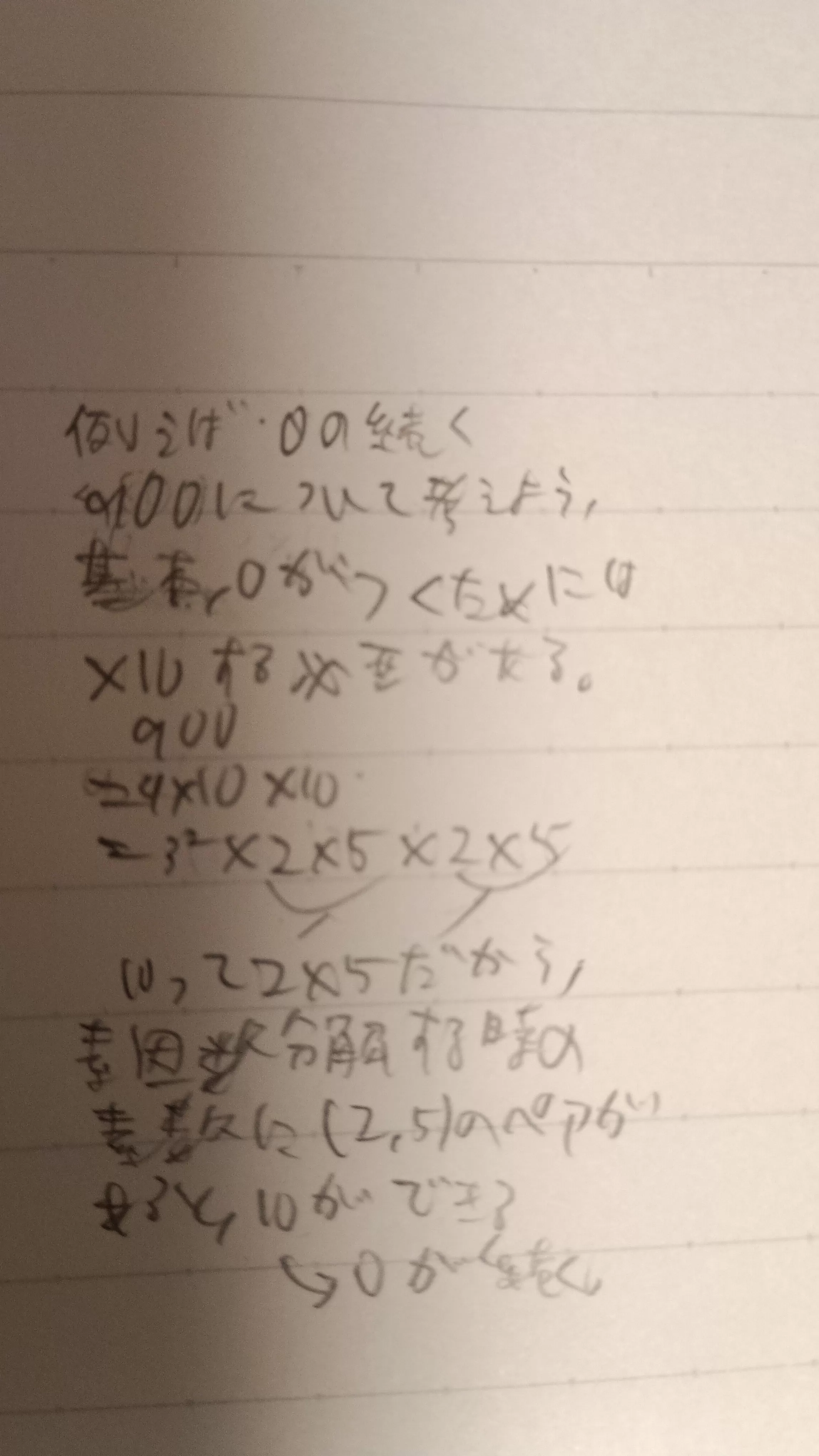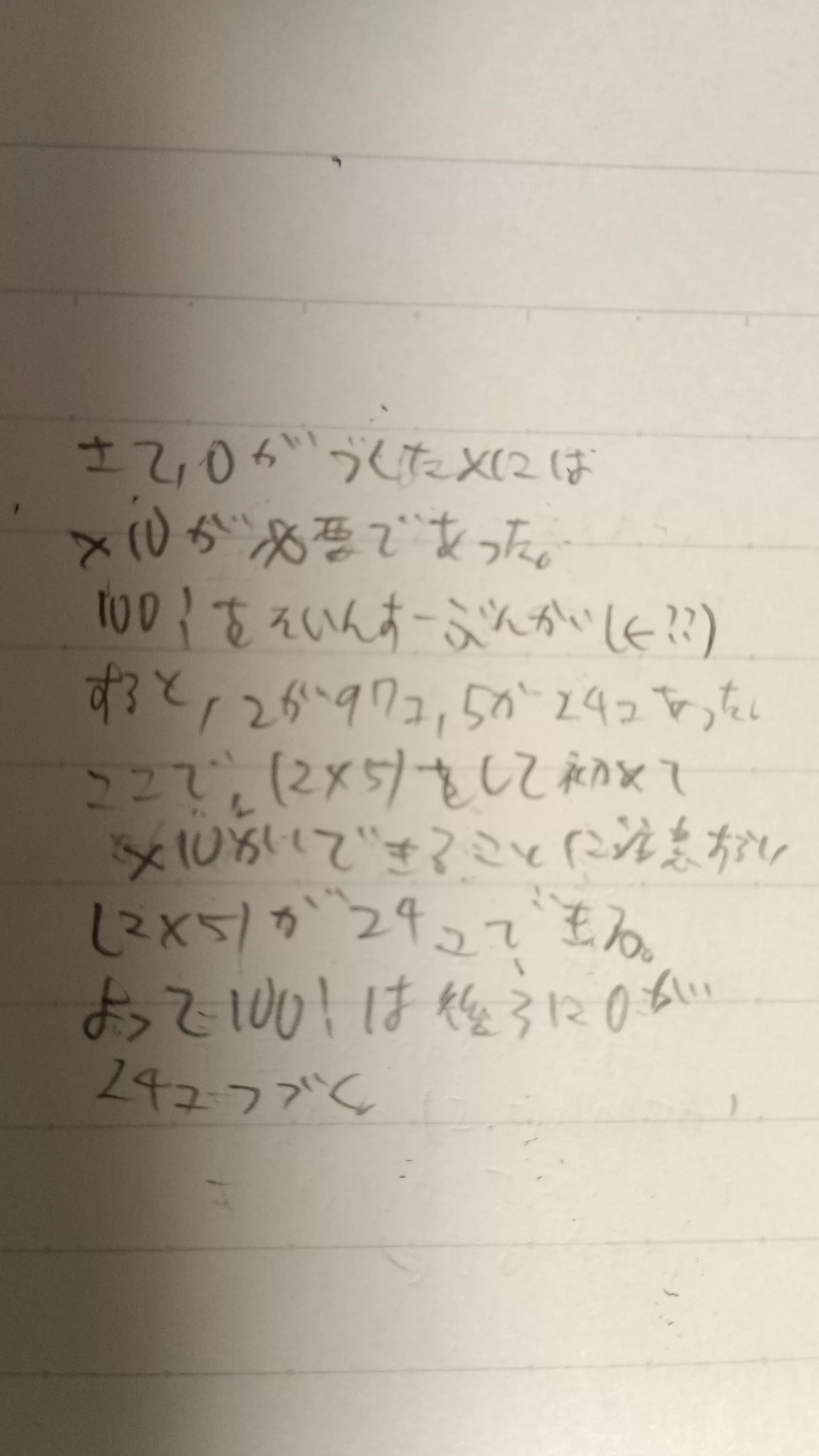 (3)の解き方を教えてほしいです。答えは24個です。解説には「10=2×5より、100!を素因数分解したときの素因数2と素因数5の個数で決まる。」と書いてあるのですが、意味がよくわかりません。そもそも100!を素因数分解するにはどうしたら良いのですか…